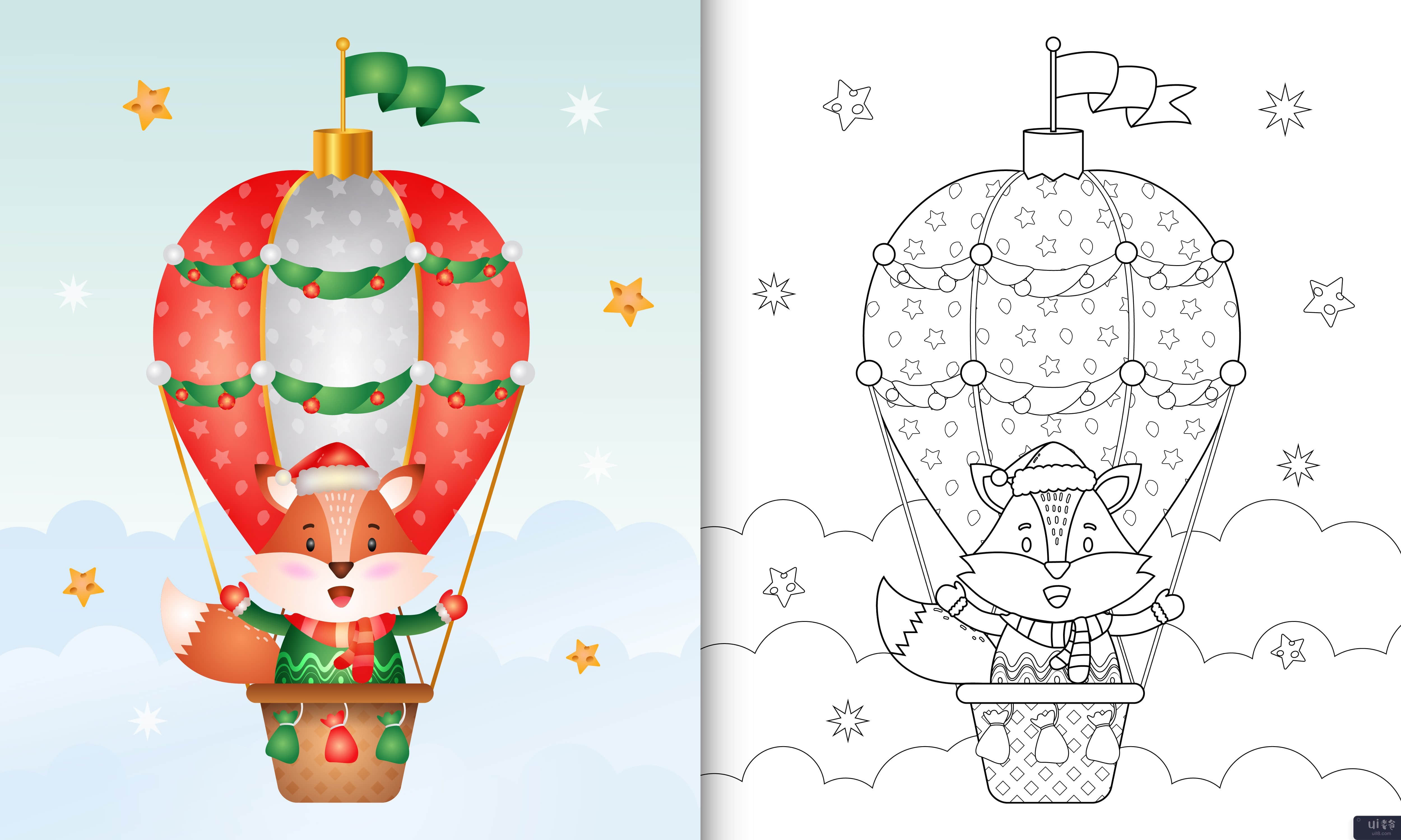 用热气球上可爱的狐狸圣诞人物着色书(coloring book with a cute fox christmas characters on hot air balloon)