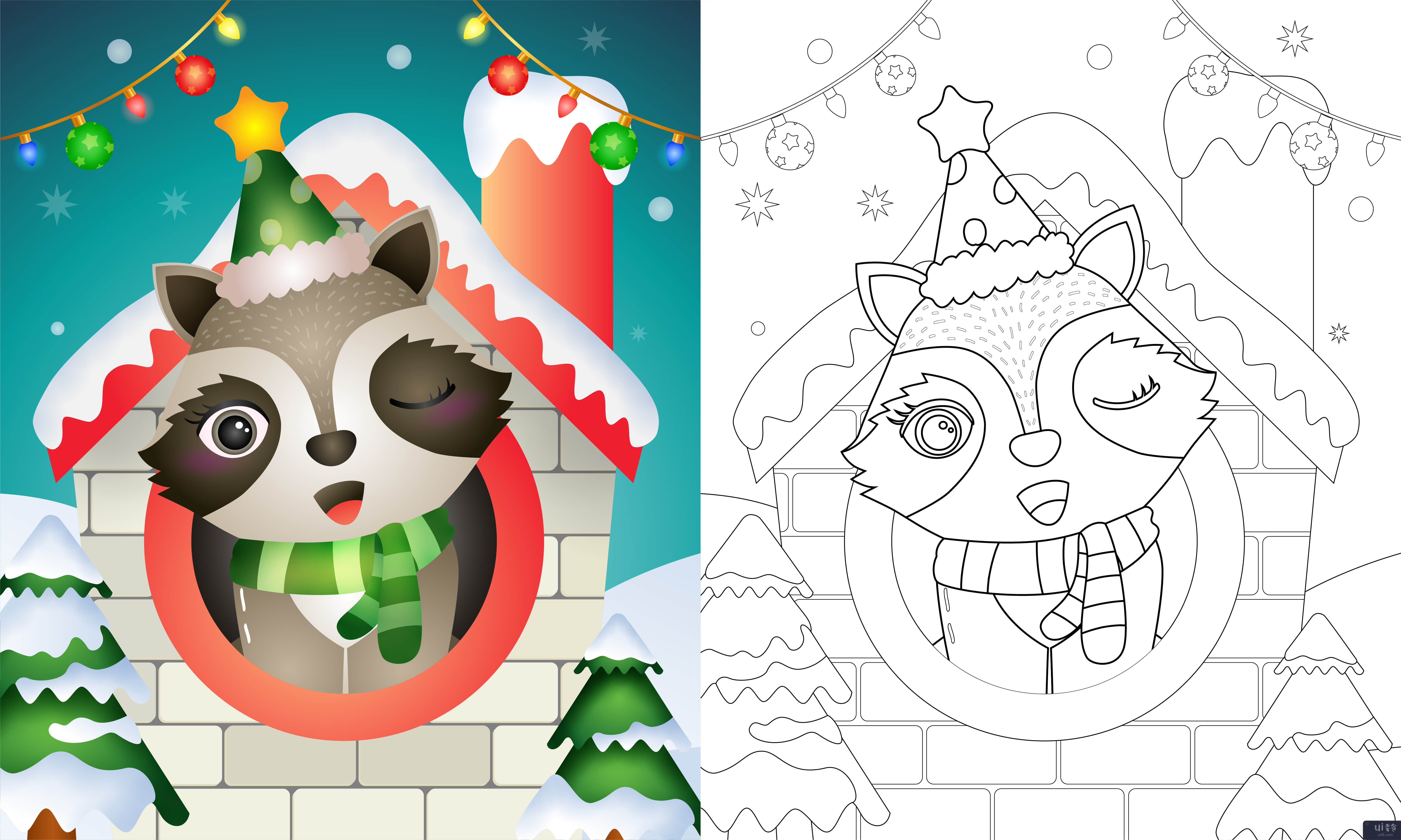 用帽子和围巾为可爱的浣熊圣诞人物着色书(coloring book with a cute raccoon christmas characters using hat and scarf)