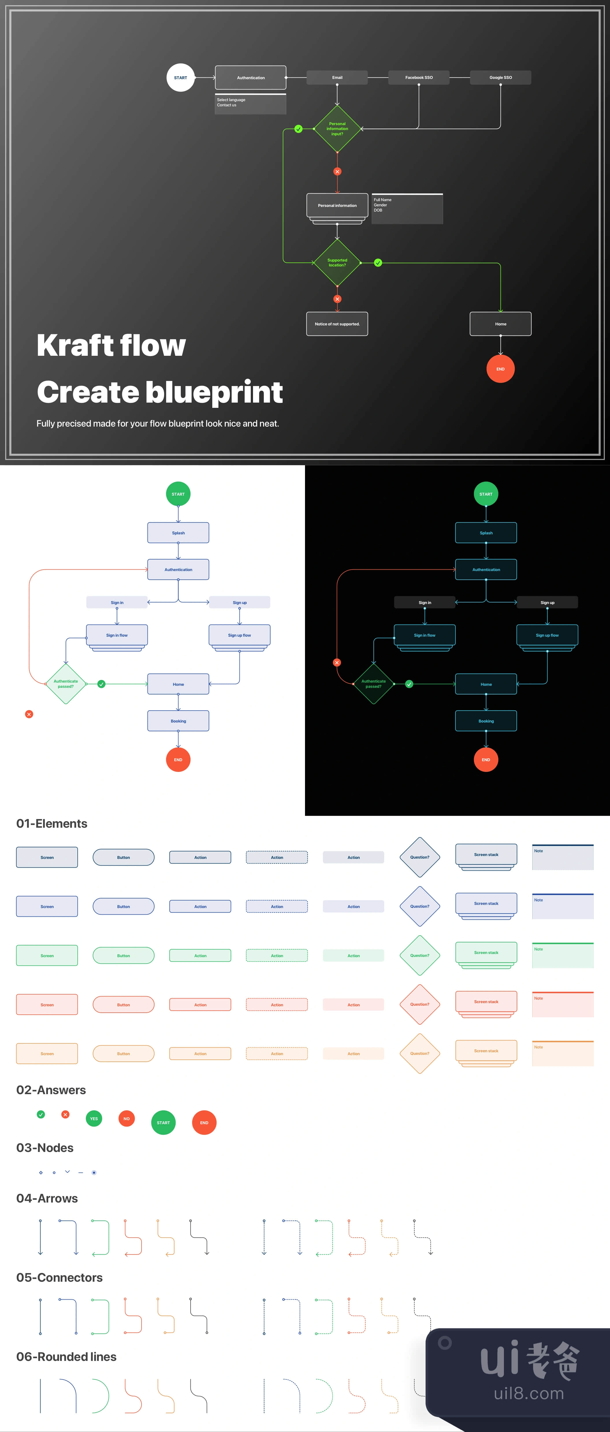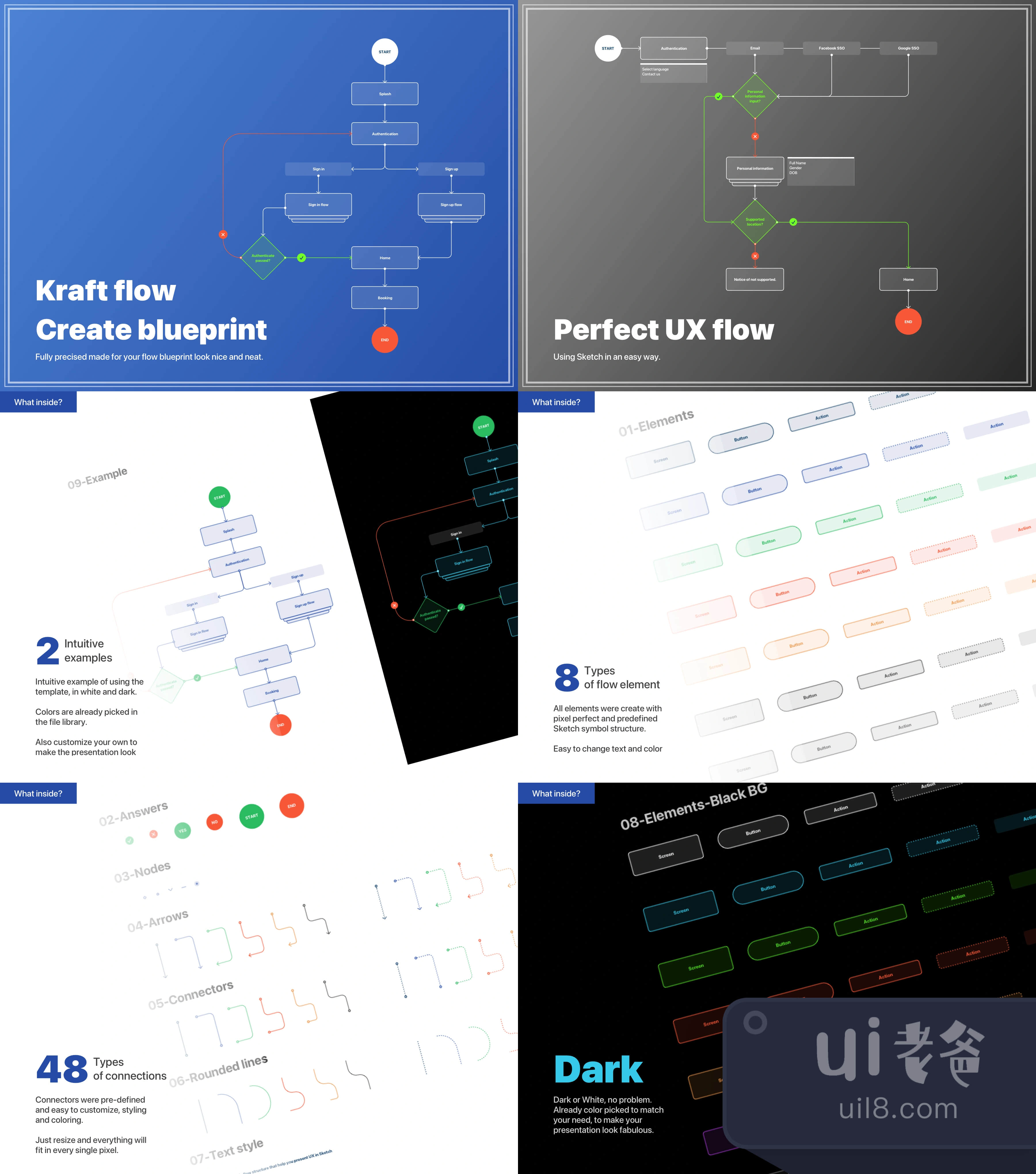 This Sketch file is full of precise and pre-defined symbols for you to create a perfect UX flow.