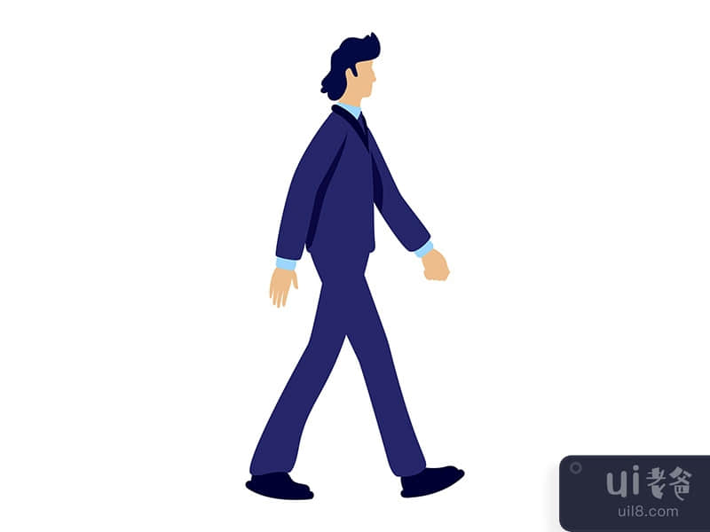 深蓝色西装半平面彩色矢量字符的自信办公室经理。行走的身影。白色的全身人。用于网页图形设计和动画的简单卡通风格插图。
