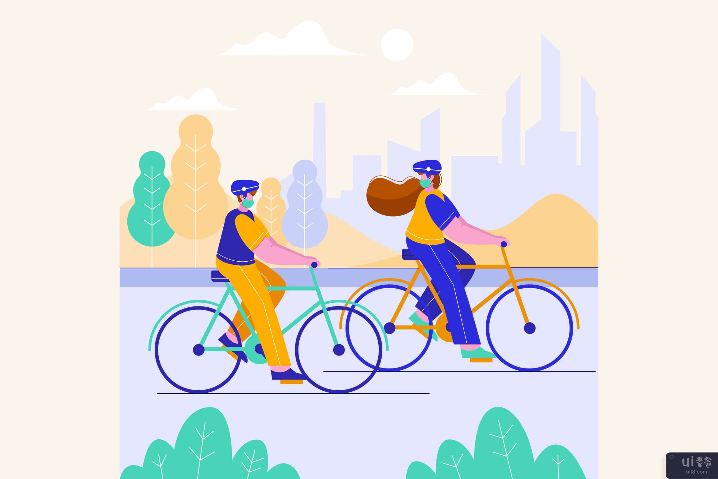 在城市公园插图中骑自行车的情侣(Couple Cycling in The City Park Illustration)