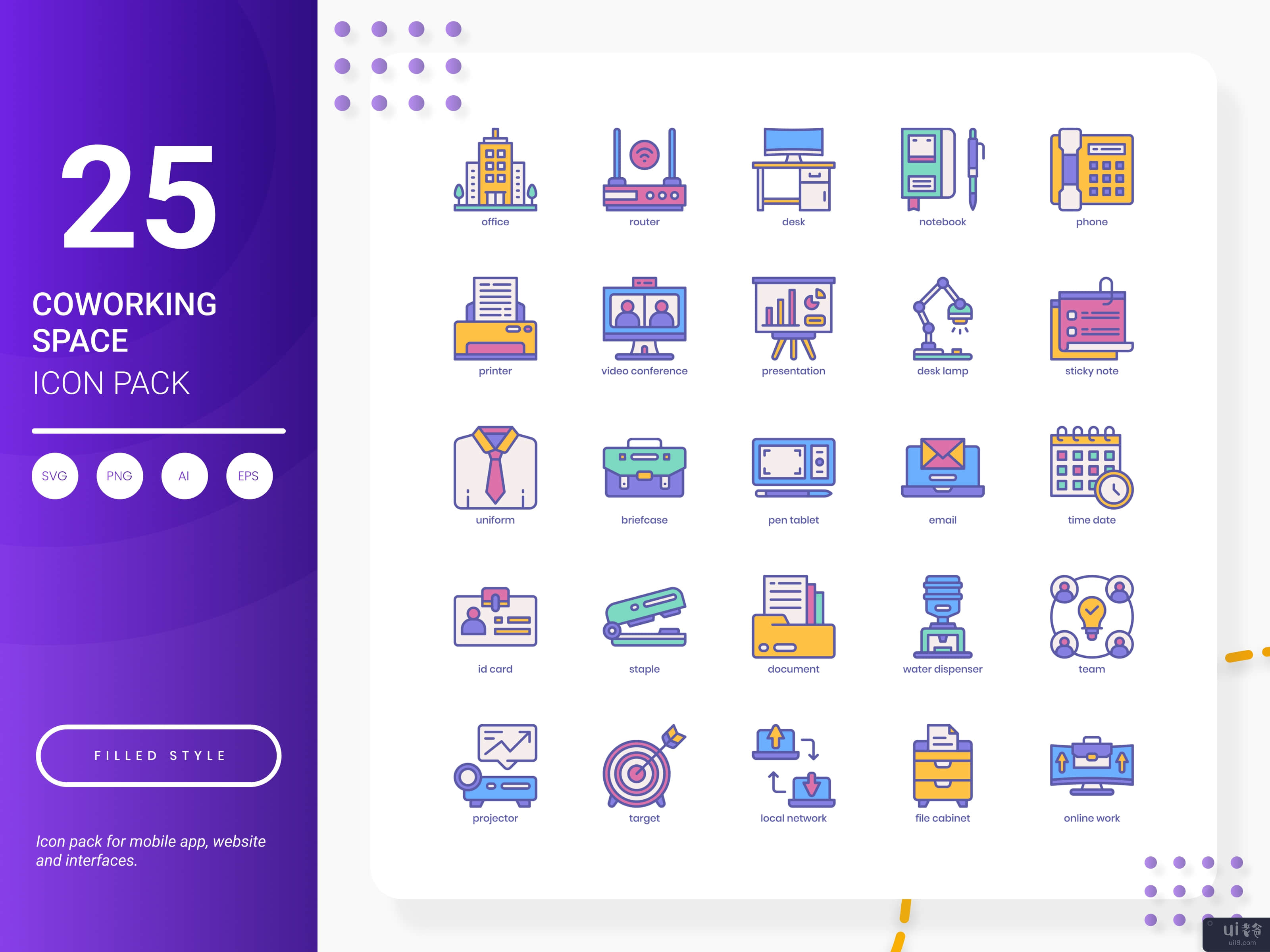 Coworking Space Icon Pack is composed of 25 stylish icons that showcase the most popular services and ideas. It's perfect for website design, mobile applications, presentations, analytical reports, infographics, or website templates.