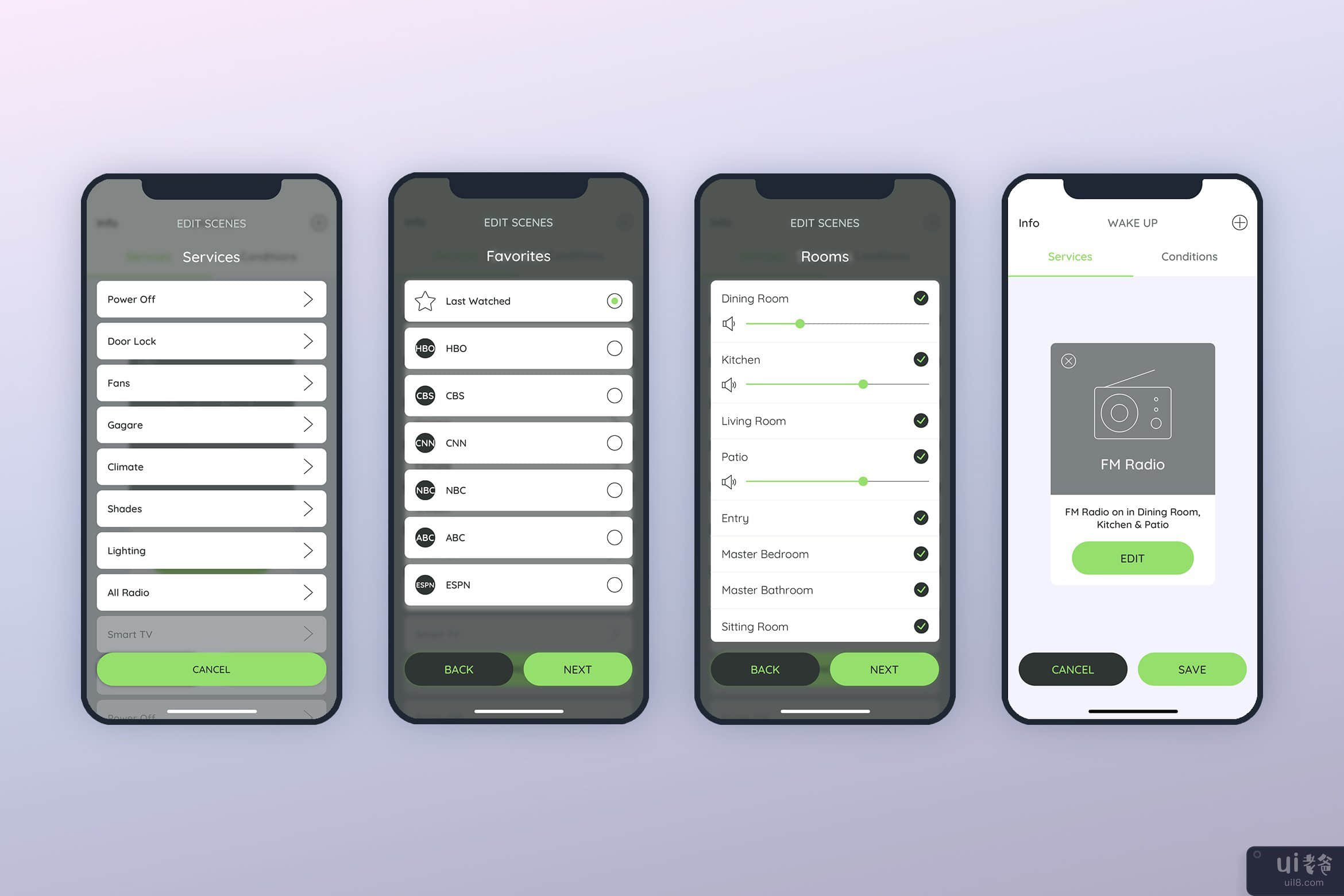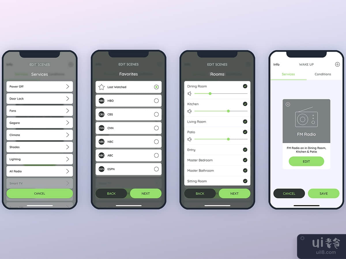创建服务电台 - Smarthome 移动 UI 包括:4 个屏幕