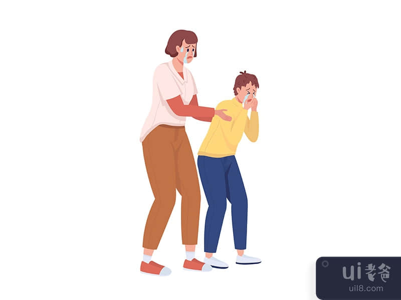 哭泣的母亲拥抱儿子的肩膀半平面彩色矢量字符(Crying mother embracing son shoulders semi flat color vector characters)