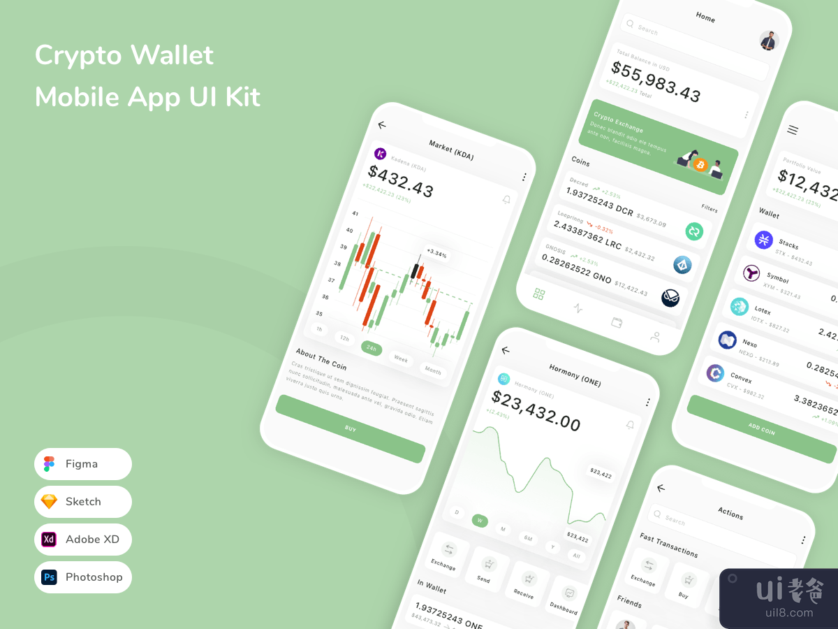 Crypto Wallet Mobile App UI Kit 设计符合现代设计趋势。