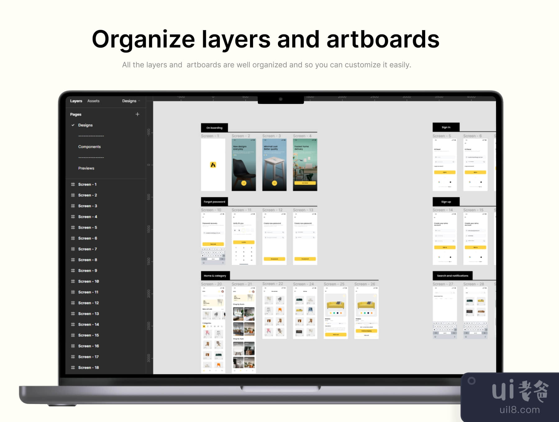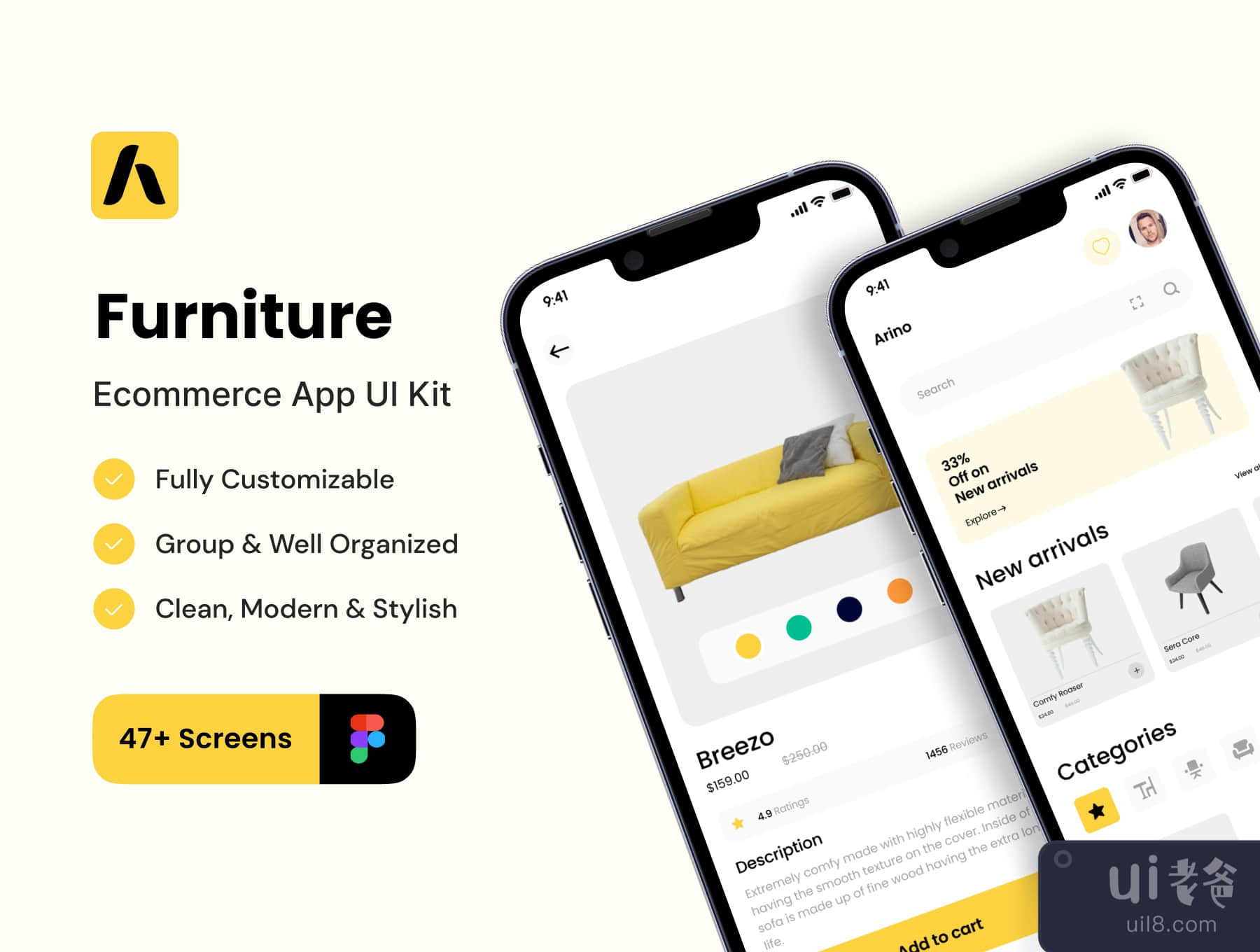 Arino是一个高质量的家具电子商务应用UI套件,由47个以上像素完美的屏幕组成,并在Figma中易于使用。