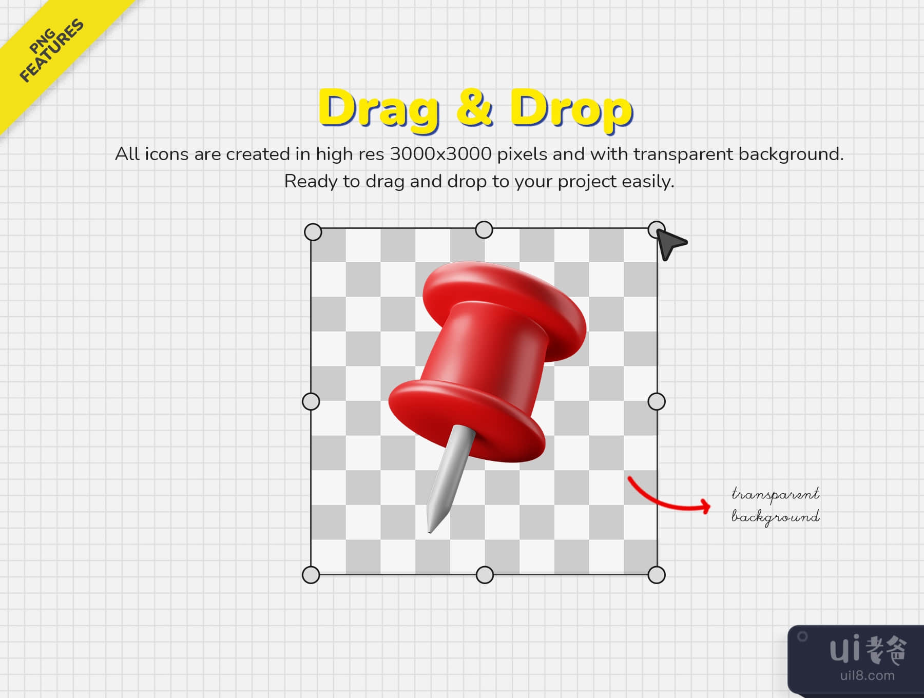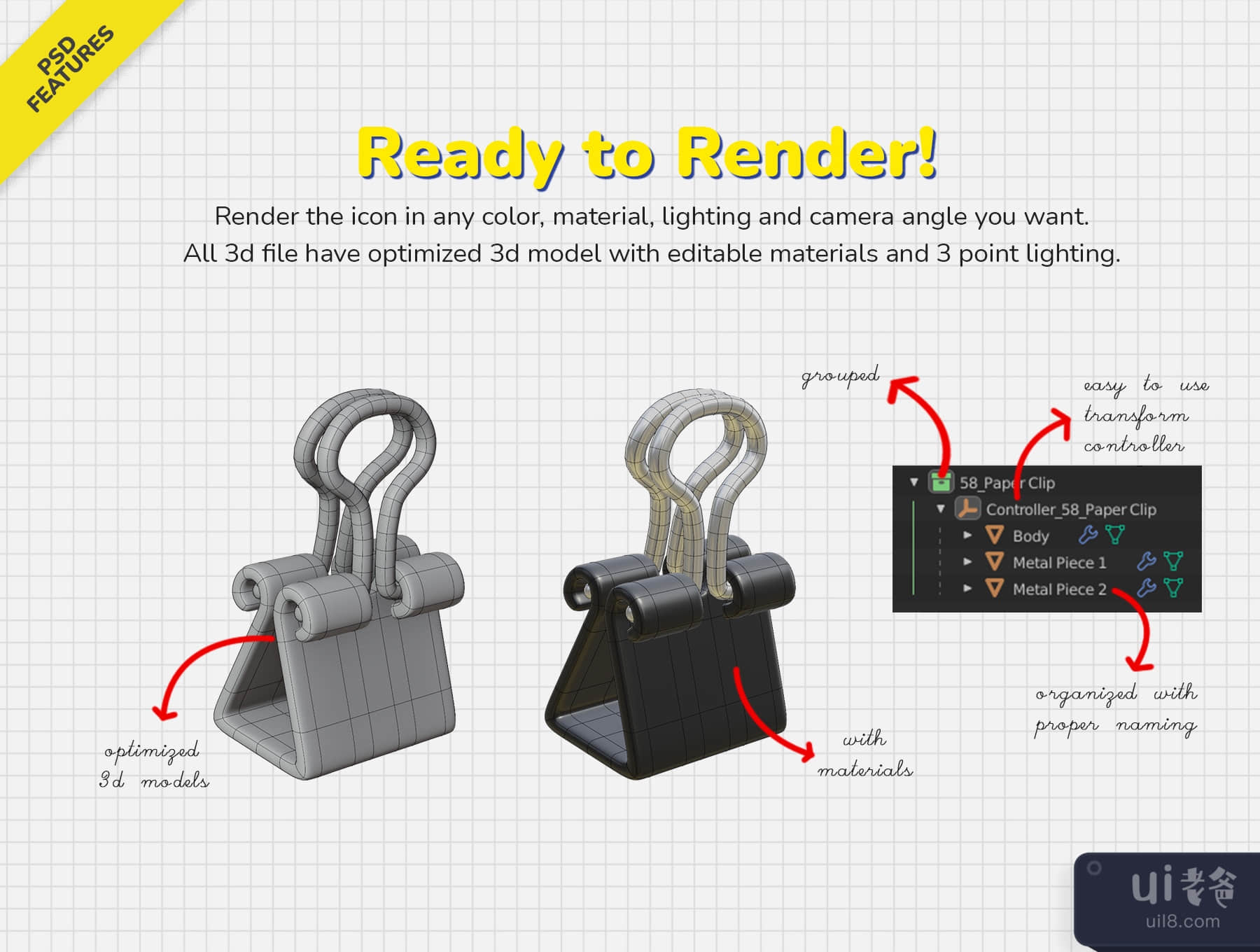 这个图标集是为你在你手中获得完全的定制。通过Photoshop PSD文件,你几乎可以实时改变颜色和调整外观(光泽度和阴影),不需要3D软件,只需要使用我们心爱的Photoshop。而使用3D Blender文件,你会得到内置照明和材料的模型化图标,它已经准备好了,可以进行渲染。此外,如果你想要快速,只需拖动透明的PNG到你的项目中就可以了。