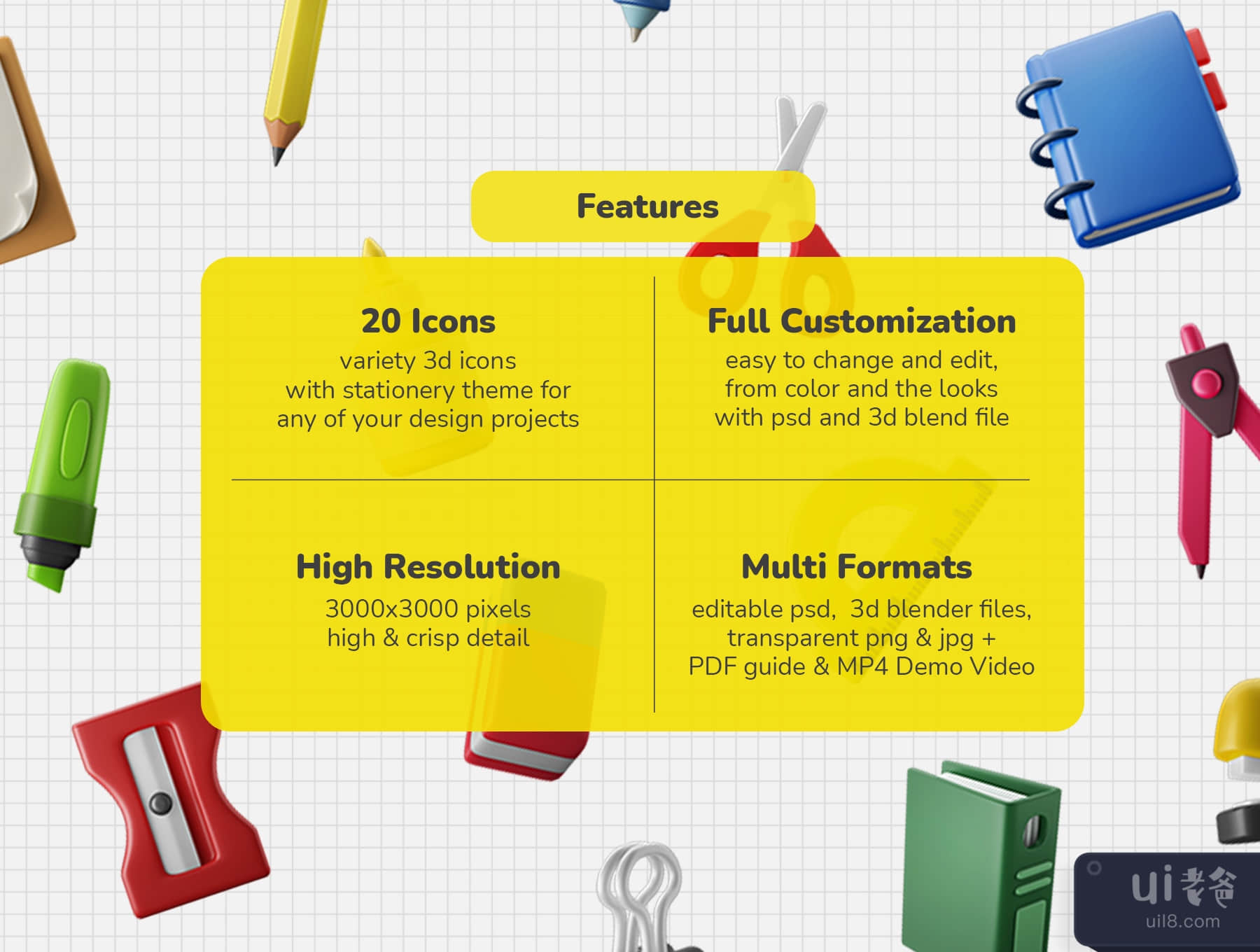 Design and make your education theme project stand out and unique with this 3d icon illustration set. Contains 20 high quality school supply / stationery theme 3d icons, available in Editable Photoshop PSD Files, 3D Blender, PNG Transparent, and JPG White Background.