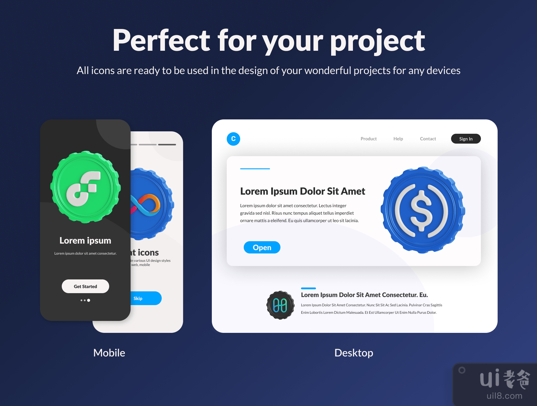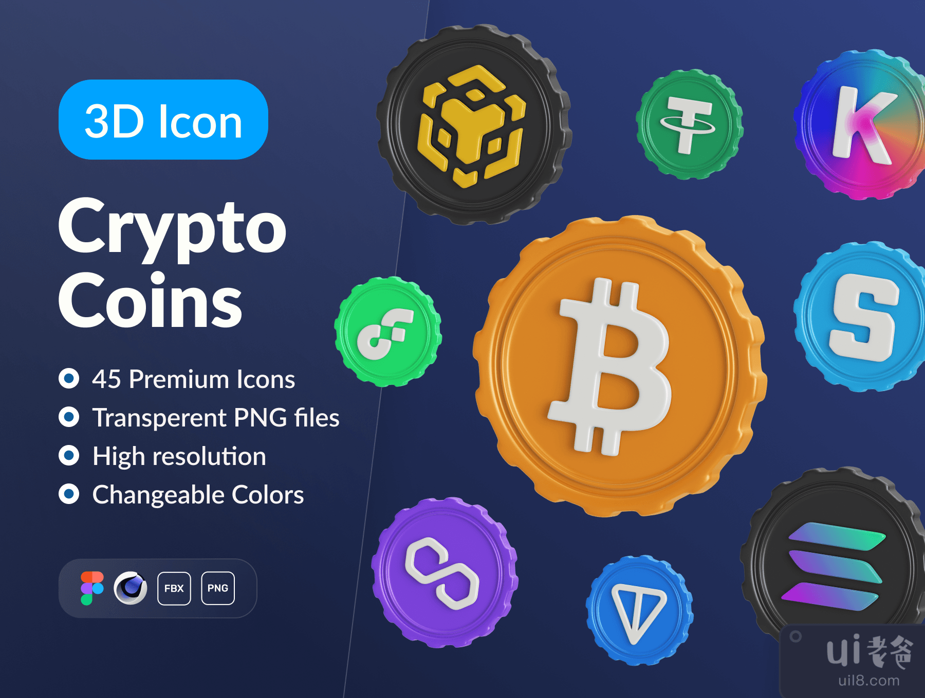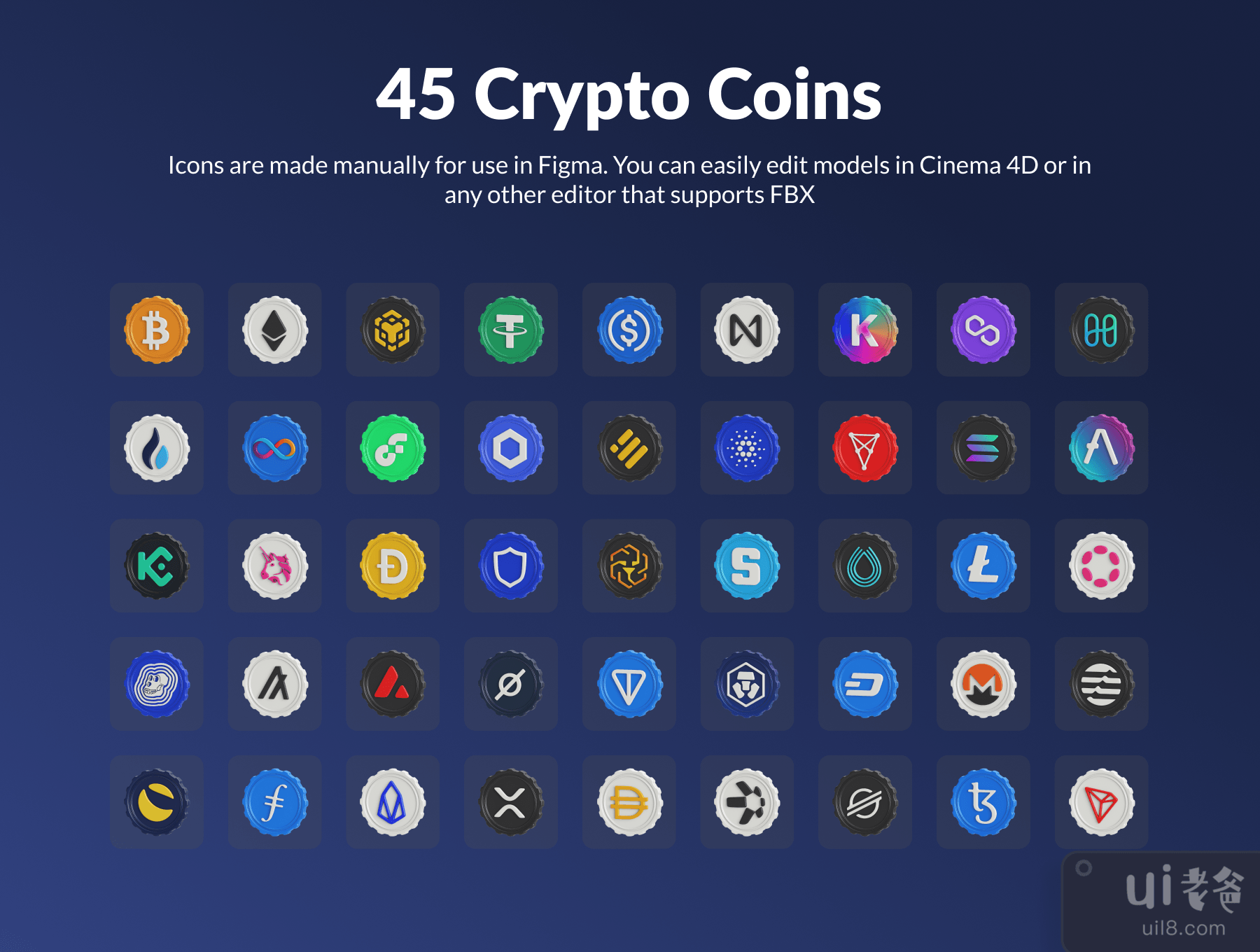集合中有 45 种最流行的加密货币的独特硬币。您可以在 Figma 中轻松编辑图标,在 Cinema 4D (.c4d) 或其他 3D 程序 (.fbx) 中完全自定义和更改图标,或者使用具有透明背景的 PNG 格式的现成图像。