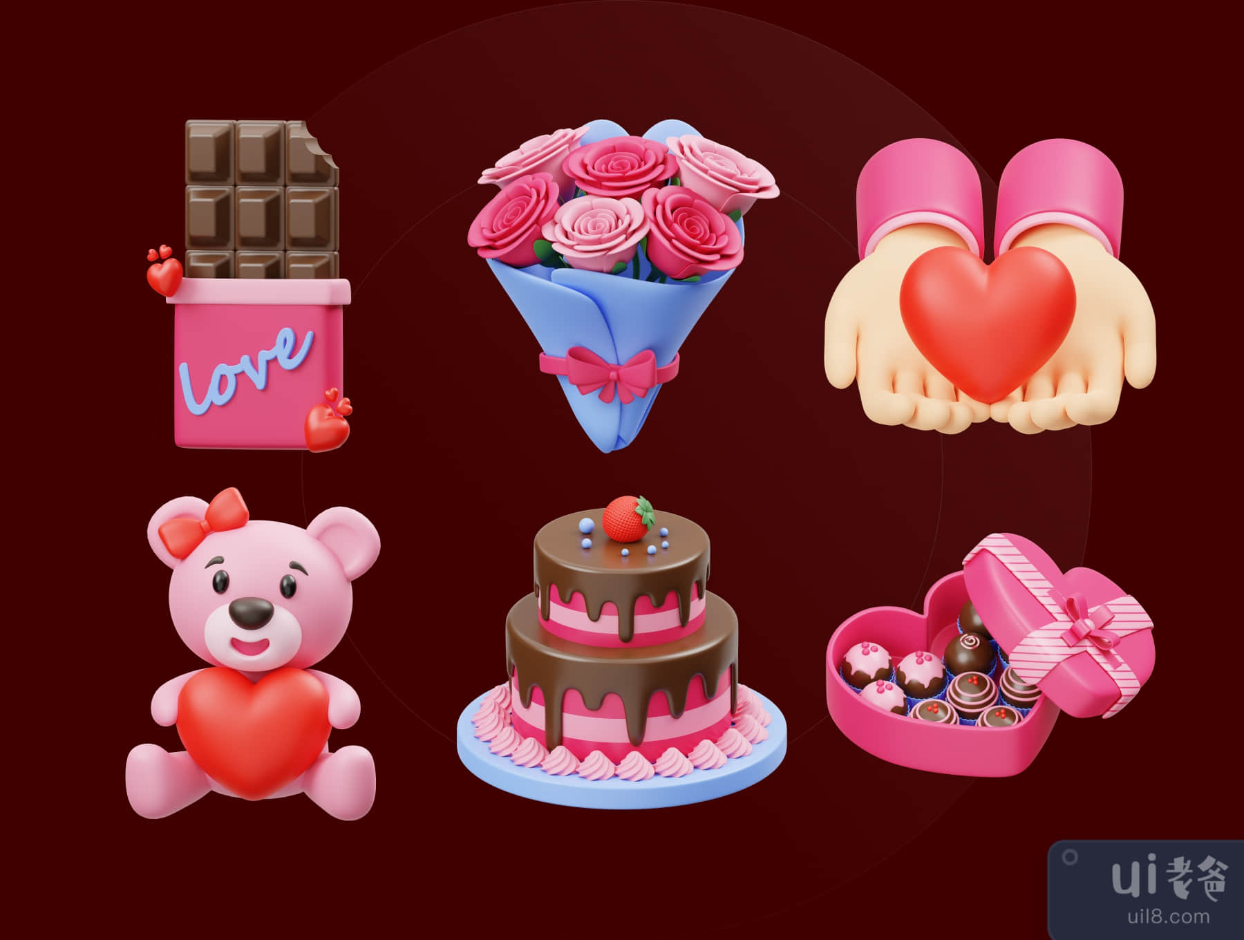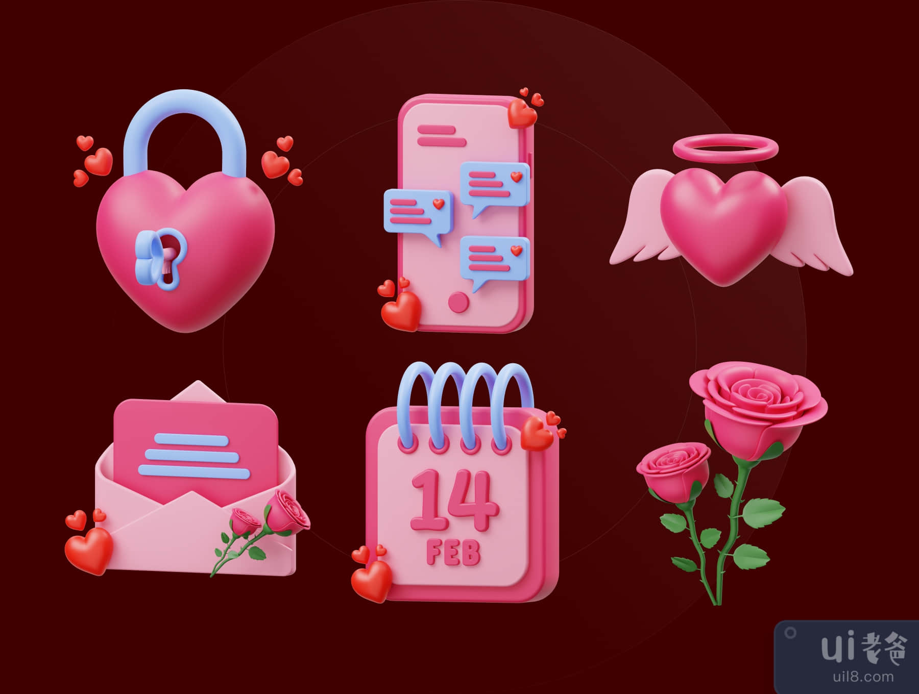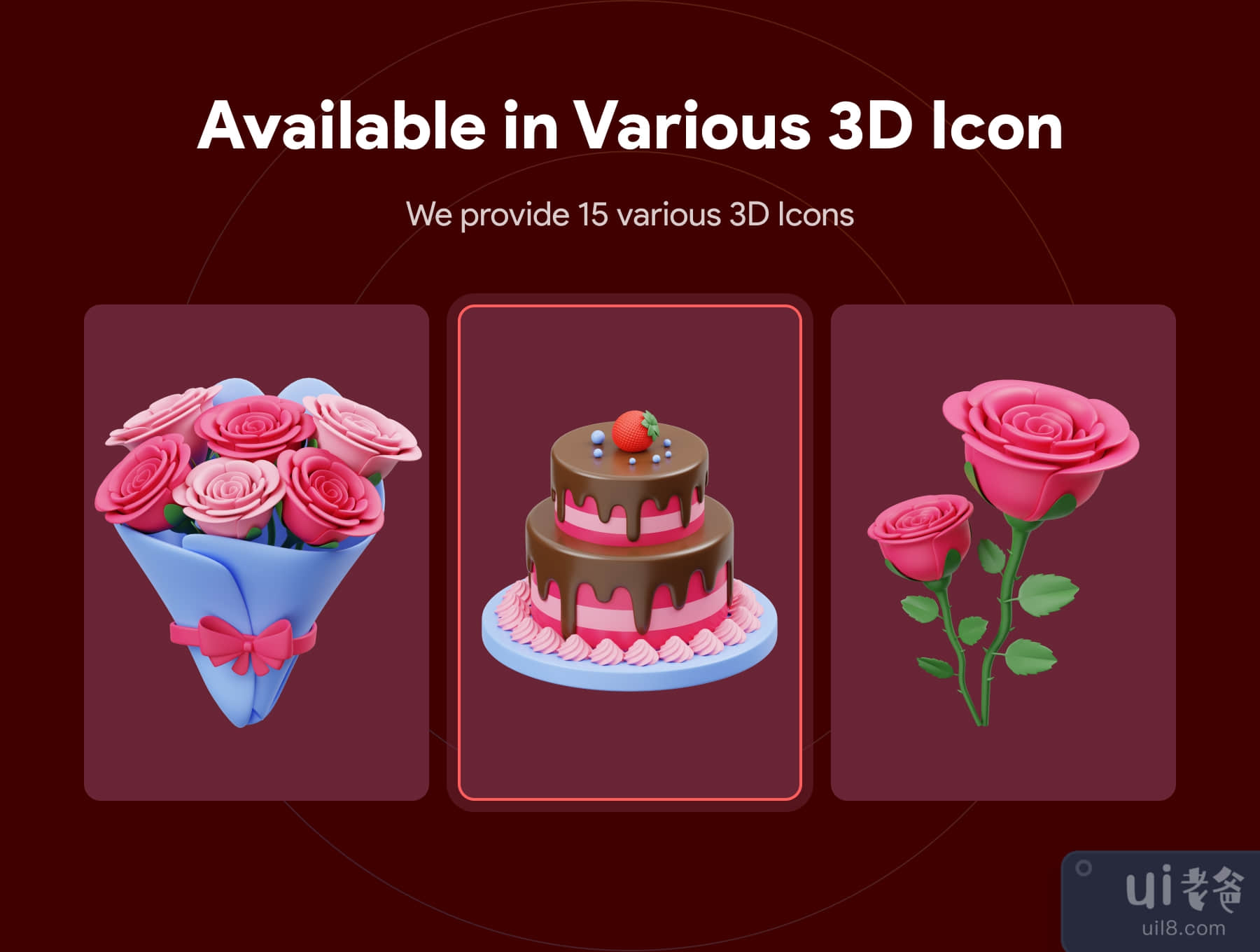 15 个现成的情人节 3D 图标文件对象,用于网站、移动应用程序等。使用 3D 资产增强您的设计。