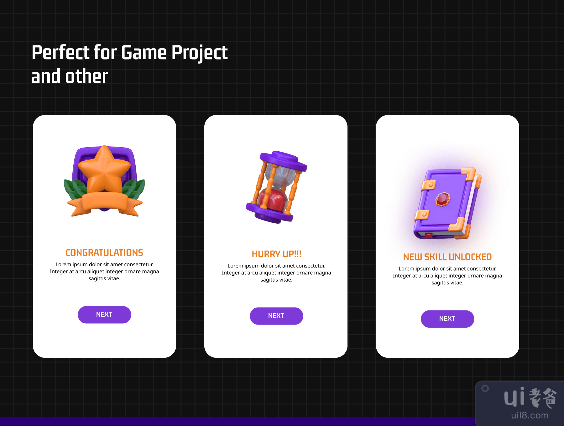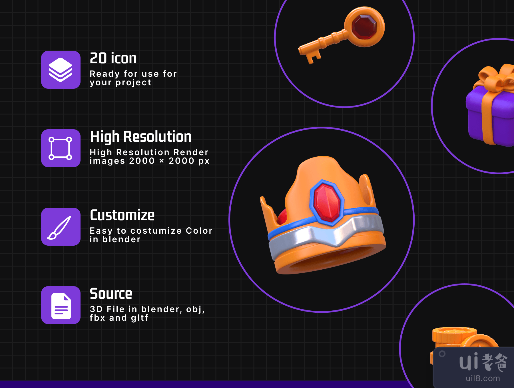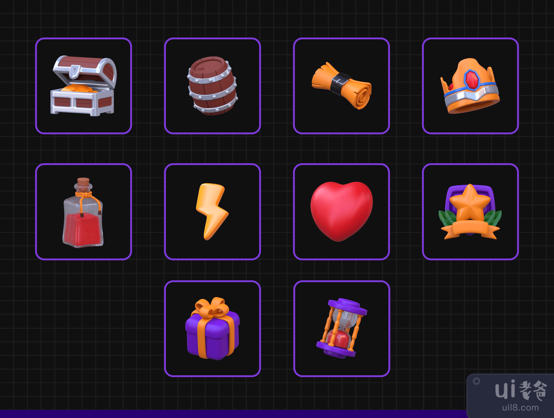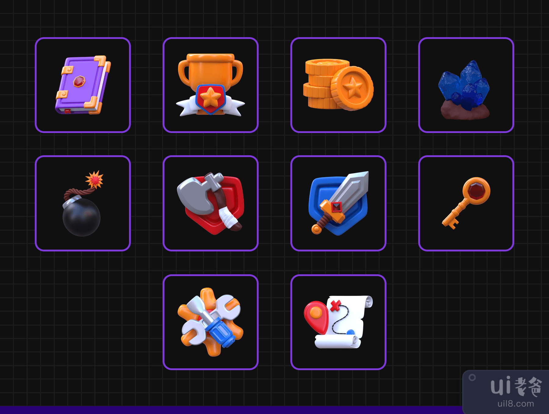 概述3D 程式化游戏图标可用于游戏行业设计需求、动画、网页设计、UI 设计、演示幻灯片、海报等。