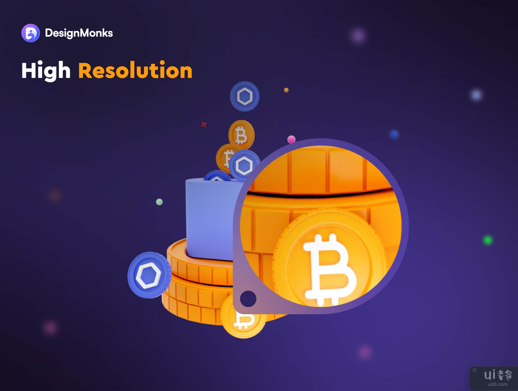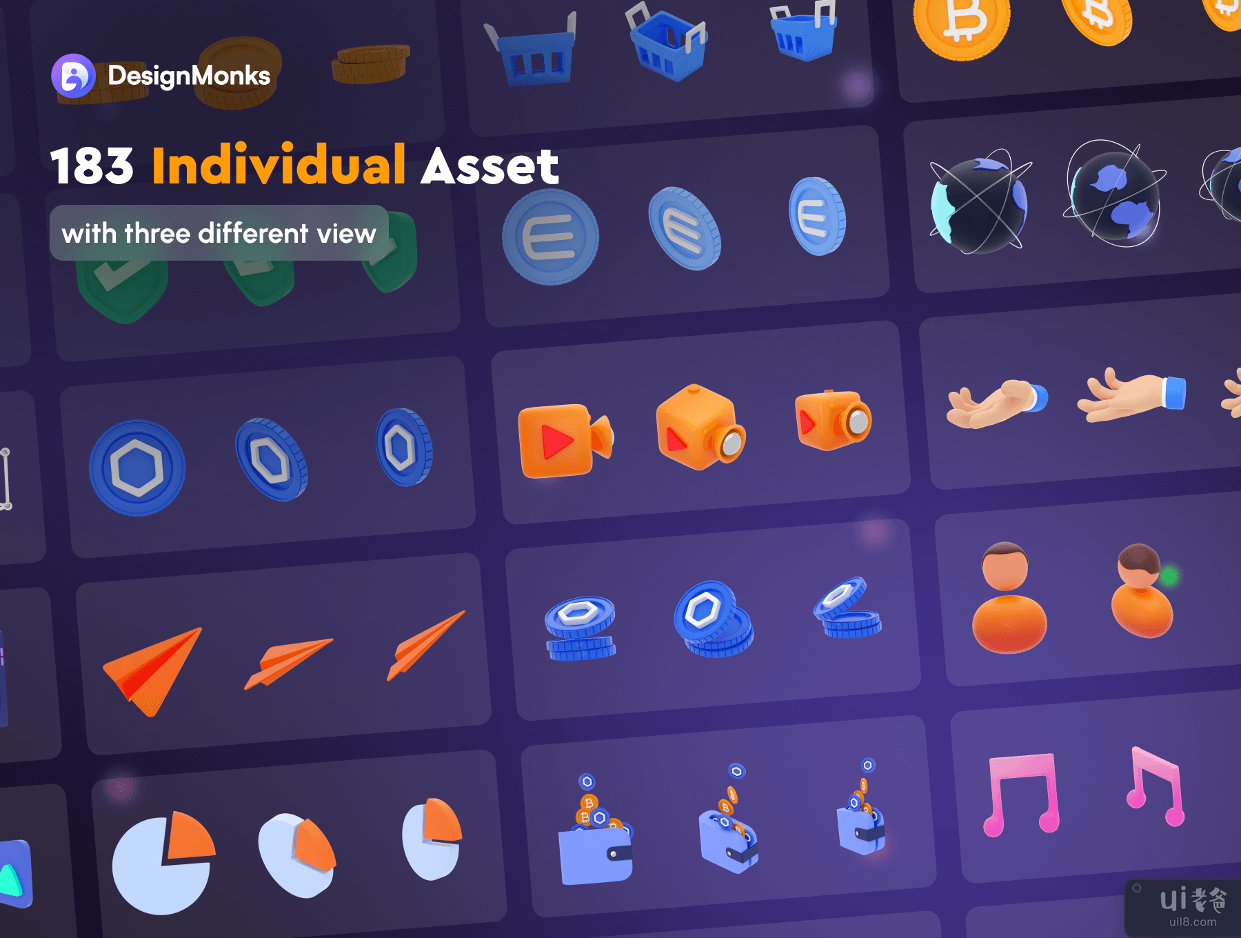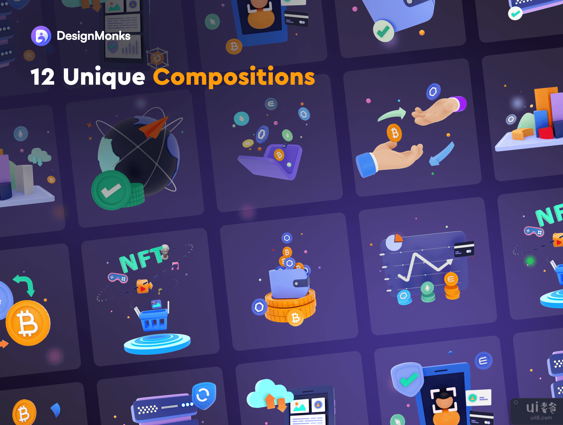 OverviewIntroducing Crypto Currency 3D Compositions and Icon Set – the ultimate resource for designers and creators in the blockchain and cryptocurrency space. Our asset library offers 12 unique 3D compositions and 183 individual 3D assets, each featuring three different angles - front, isometric, and perspective. These assets are crafted with precision and attention to detail by the expert designers at Design Monks, making them perfect for a variety of design projects.