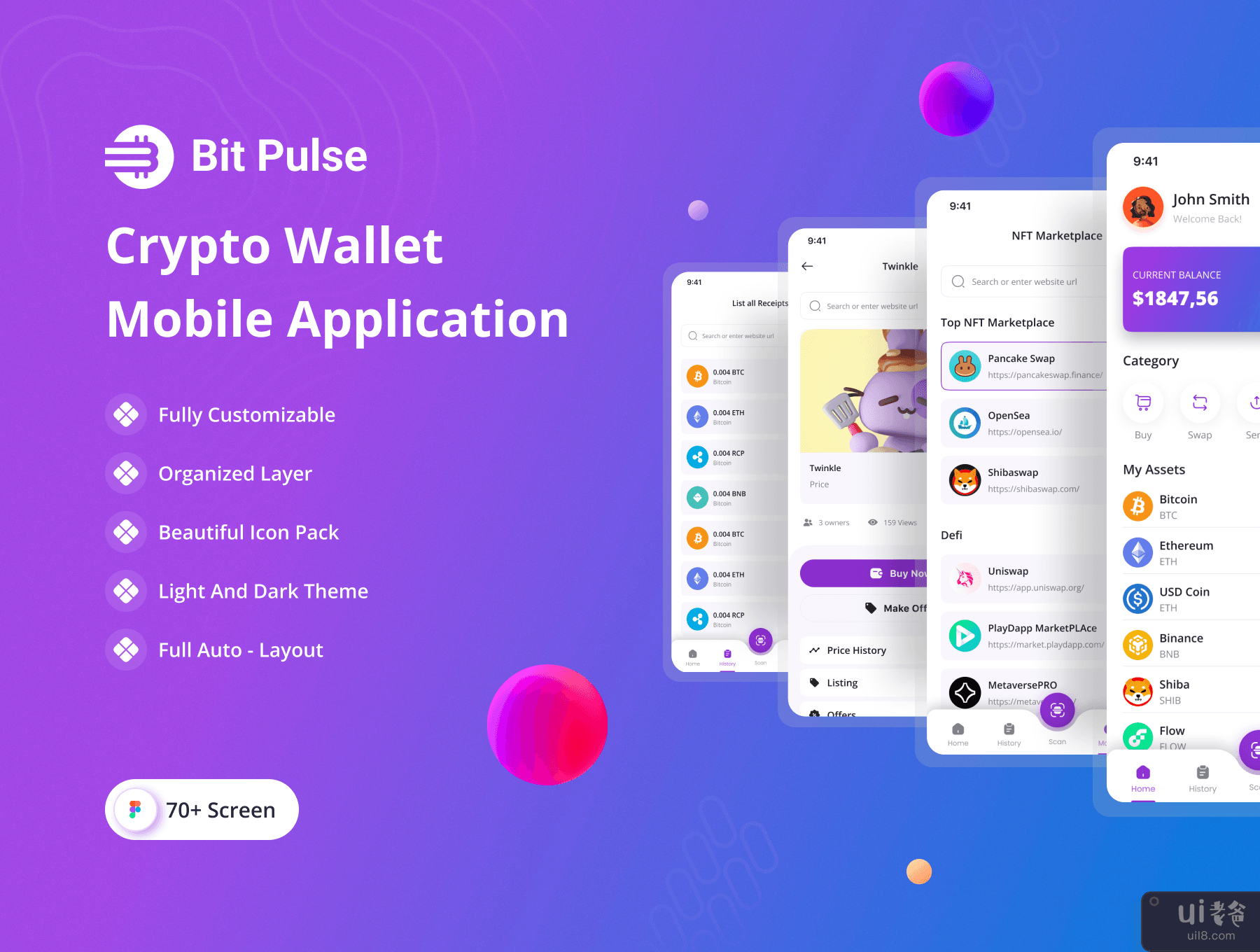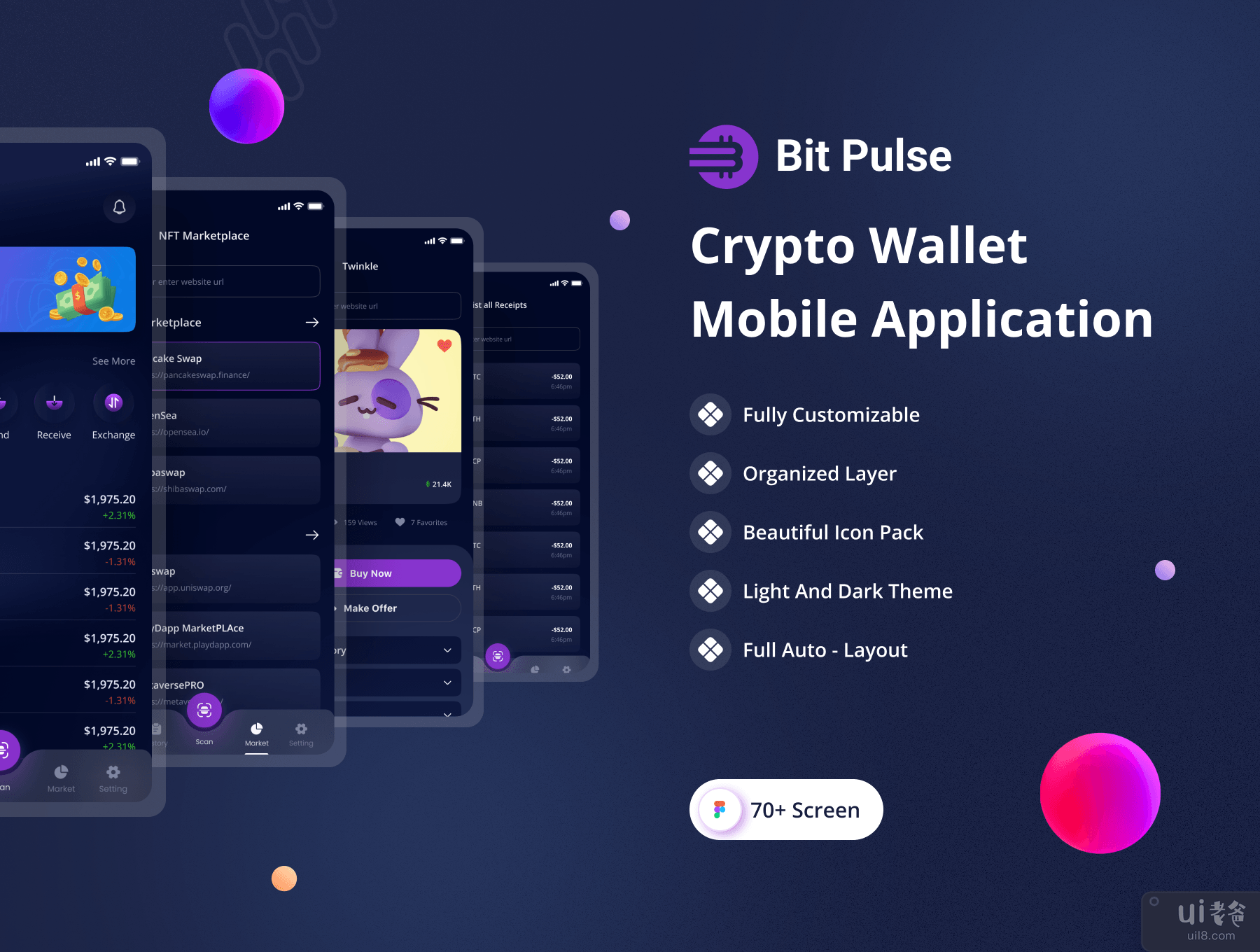 Overall, the Bit Pulse Crypto Wallet Mobile App provides users with a secure and reliable cryptocurrency wallet app that is easy to use and understand.Highlights70+ Premium screensMade with google fontFull customizableModern and minimalist styleNeatly & Organized LayerDark & Light VersionFormat93.1 MB in1 File