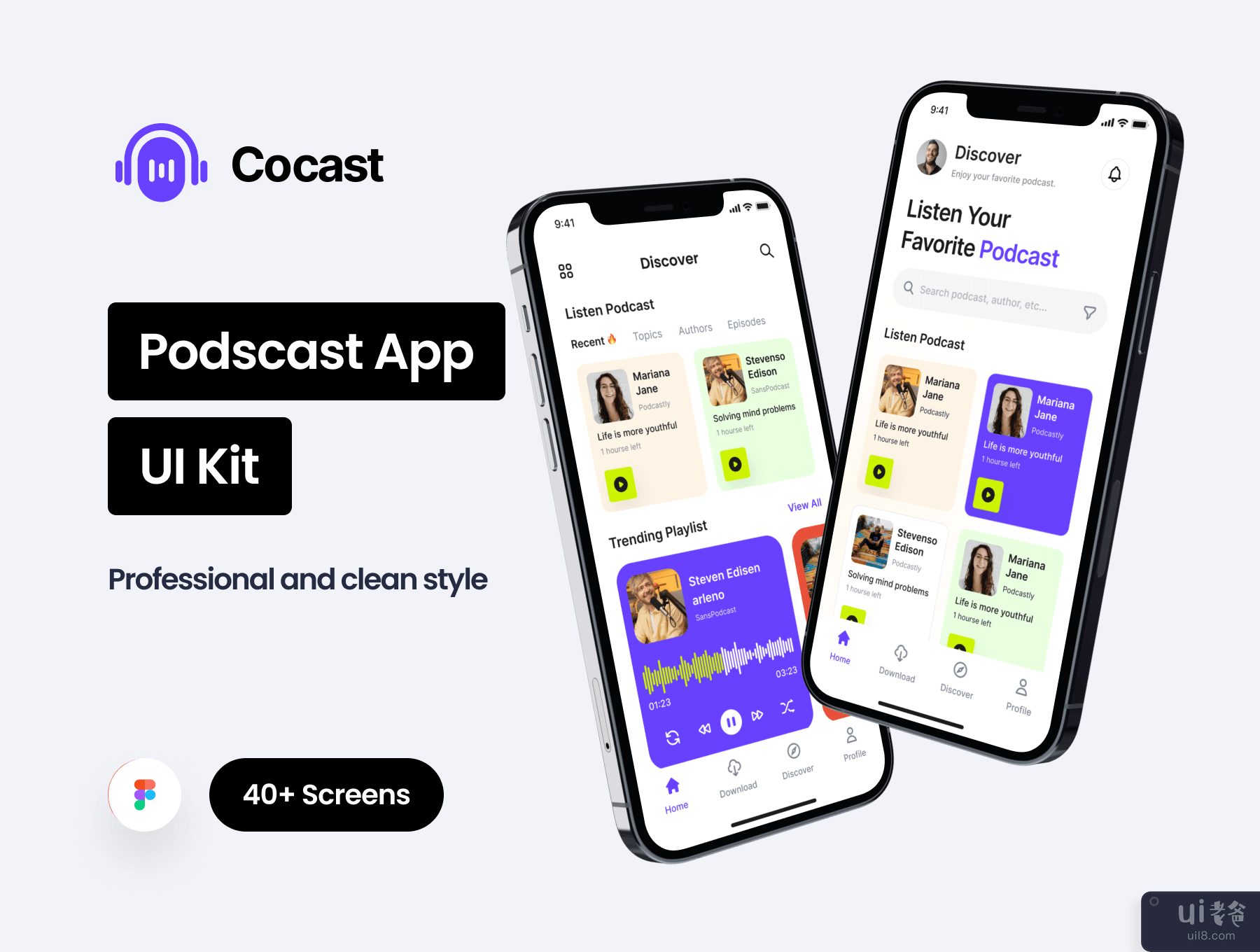 OverviewCocast is a mobile app for podcasts. There are many variant styles of the home screen, podcast details, discover, browse, and other features. This Figma file includes 42 screens.