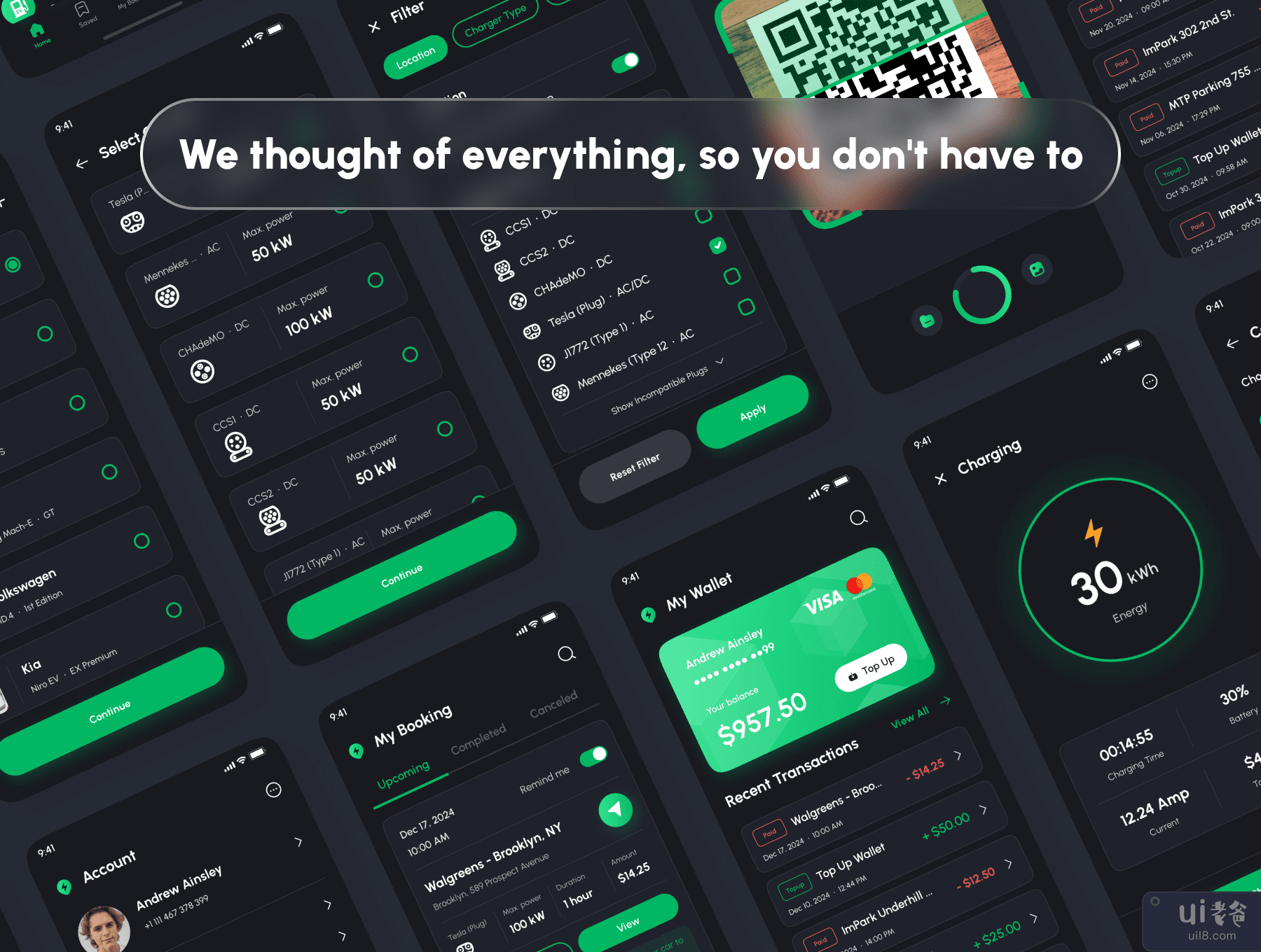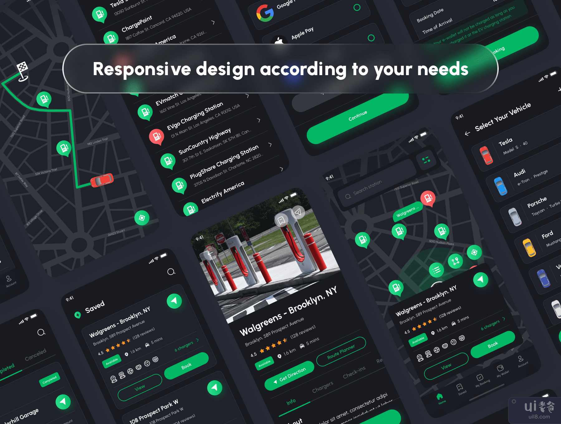 EVPoint 支持 iOS/Android(包括设计系统)和 170 个屏幕,100% 可编辑和可定制。 Figma 中提供了设计。此外,该设计还配备了Light & Dark Theme 版本。