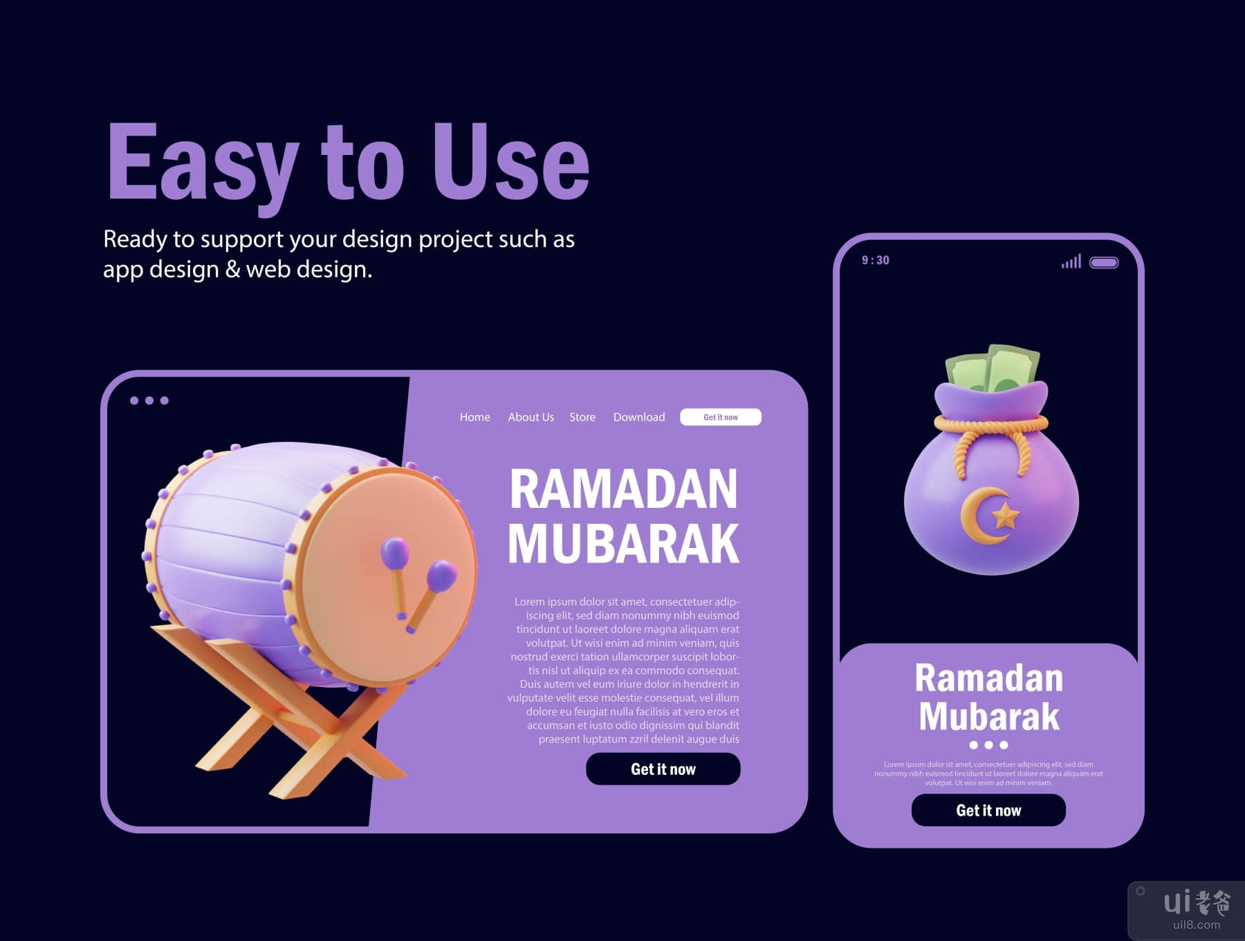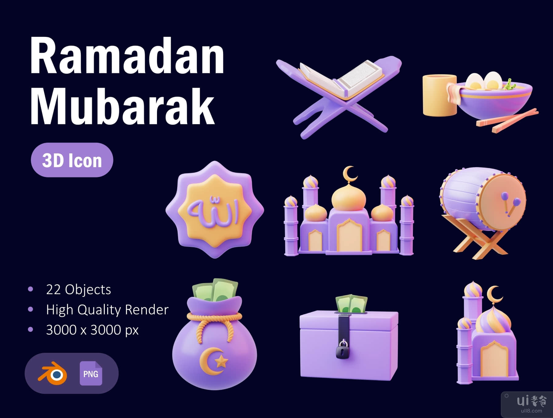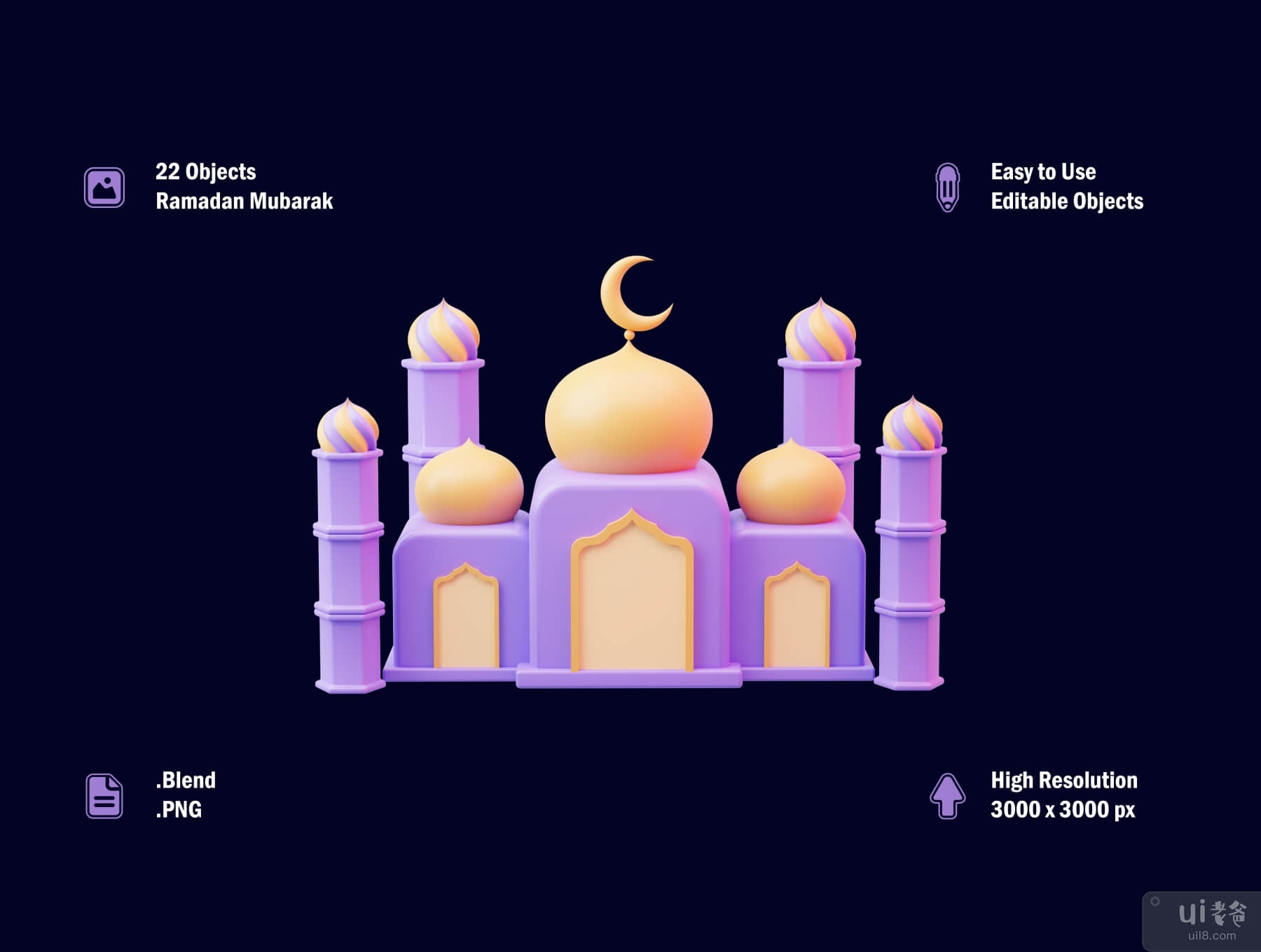 概述Ramadan Mubarak 3D Asset 可用于设计需求、动画、网页设计、UI 设计、演示幻灯片、海报等。