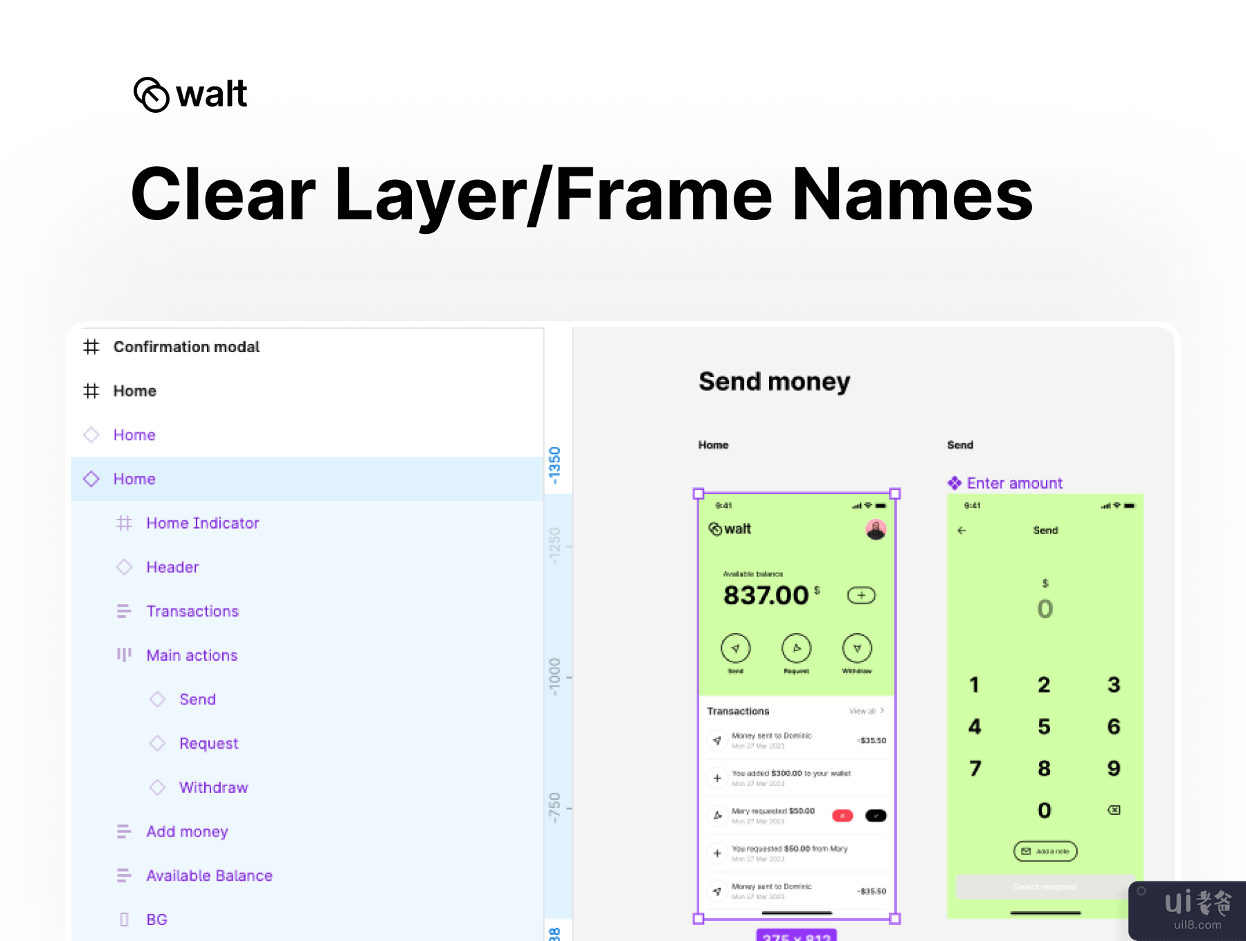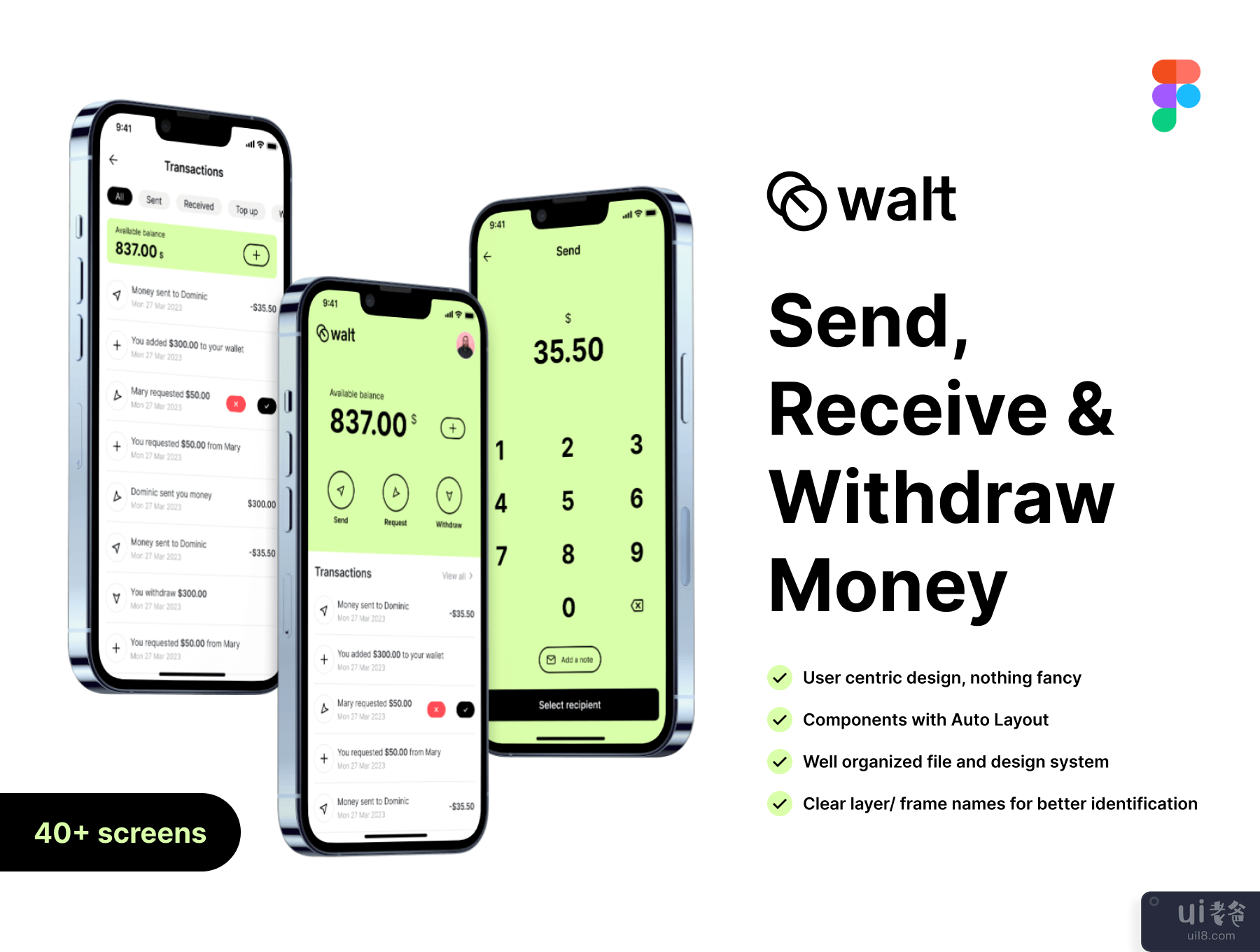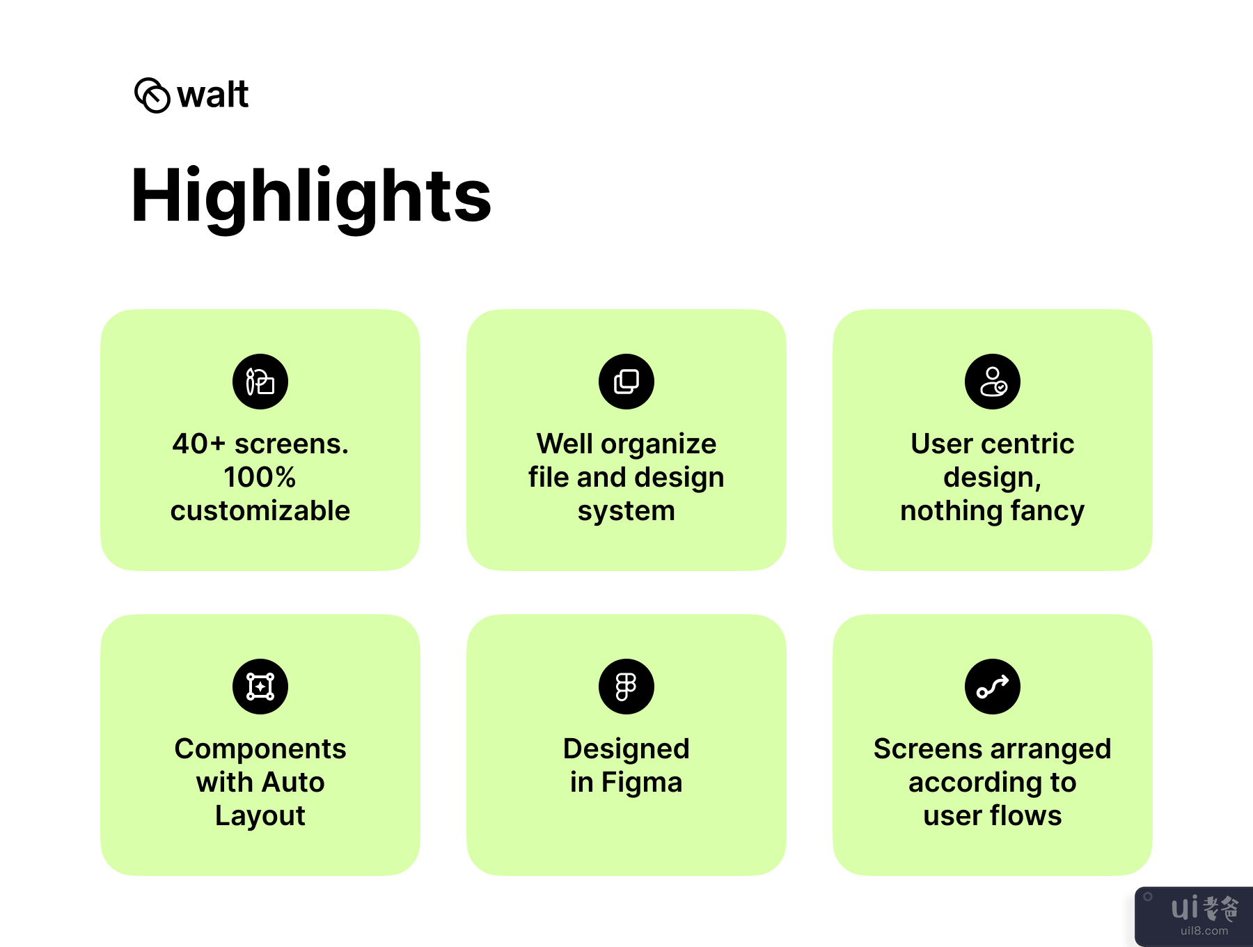 Download the Walt UI Kit today and customize according to your needsHighlights40 + screens. 100% customizableWell organized file and design system. Clear layer/ frame names for better identificationUser centric design, nothing fancyComponents with Auto LayoutDesigned in FigmaScreens arranged according to user flowsFormat1.1 MB in1 File