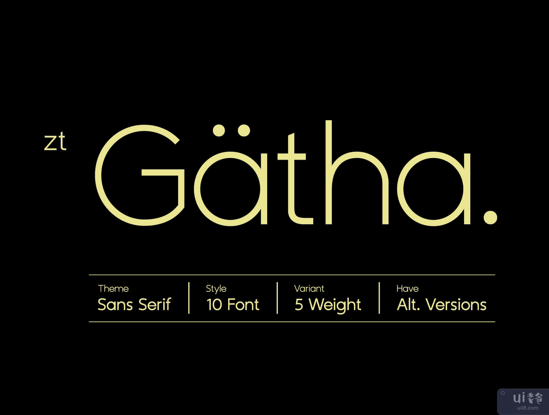 ZT Gatha features 10 styles covering a complete set of beautiful upper and lower case letters, numbers, and various punctuation marks, providing a clean and realistic sans serif style with great versatility. With a lot of weight, this typeface can be used successfully in Magazines, Posters, Branding, Websites, etc.
