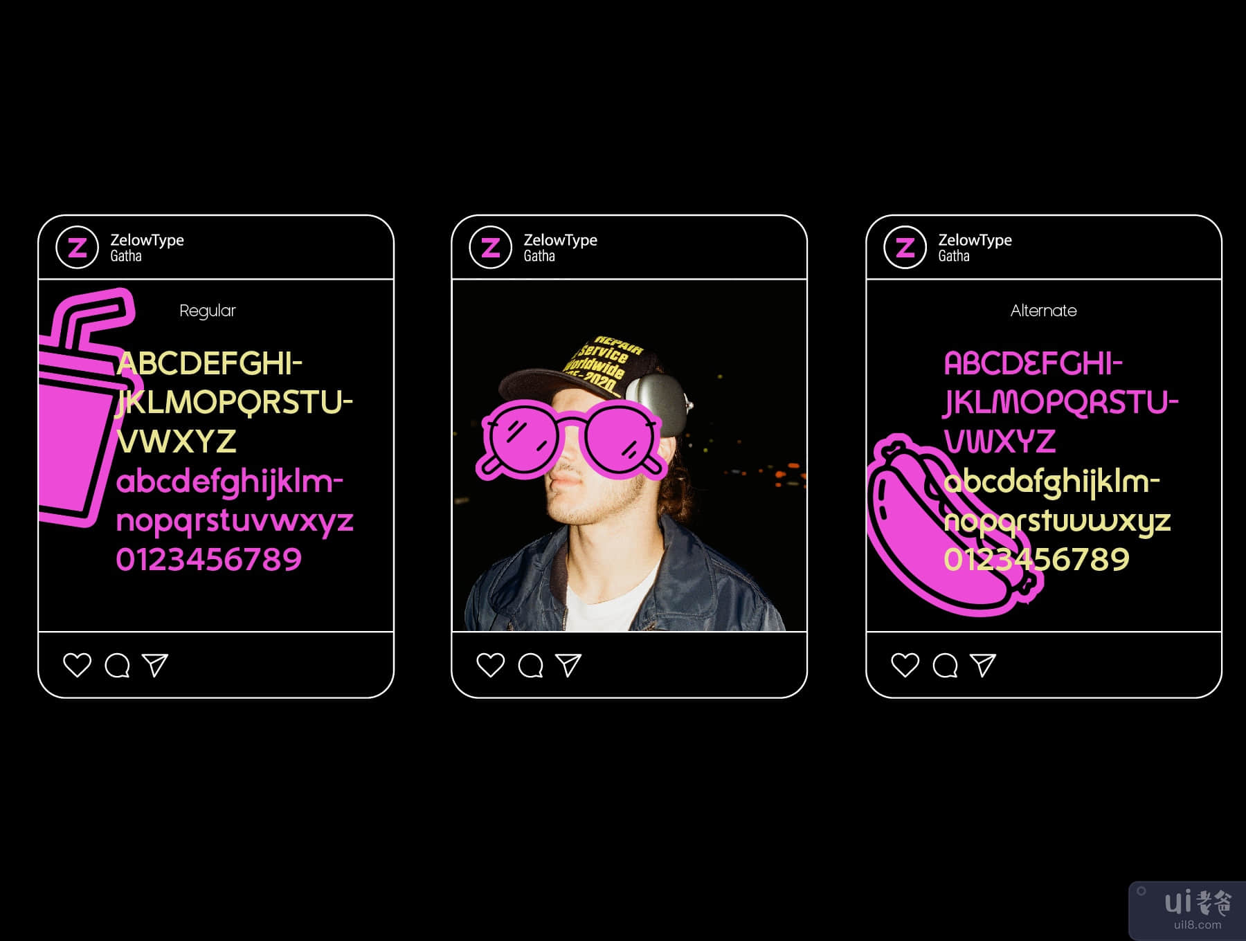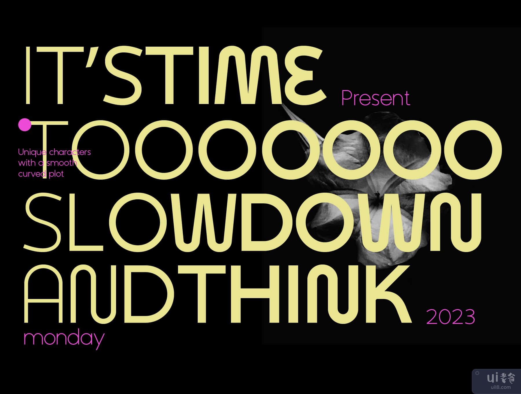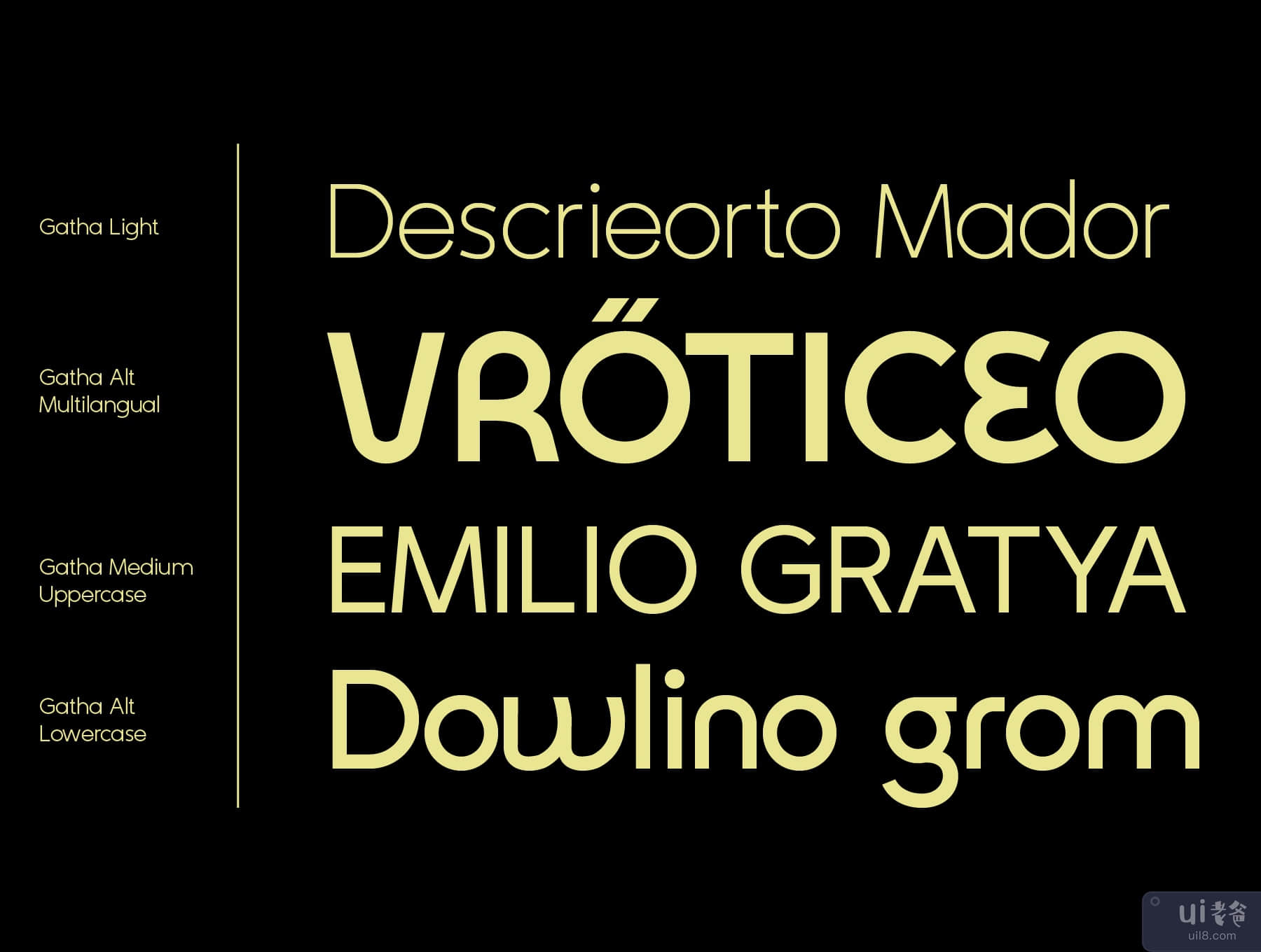 ZT Gatha 拥有 10 种风格,涵盖一整套漂亮的大小写字母、数字和各种标点符号,提供干净、逼真的无衬线风格,具有很强的通用性。这种字体重量很大,可以成功地用于杂志、海报、品牌、网站等。