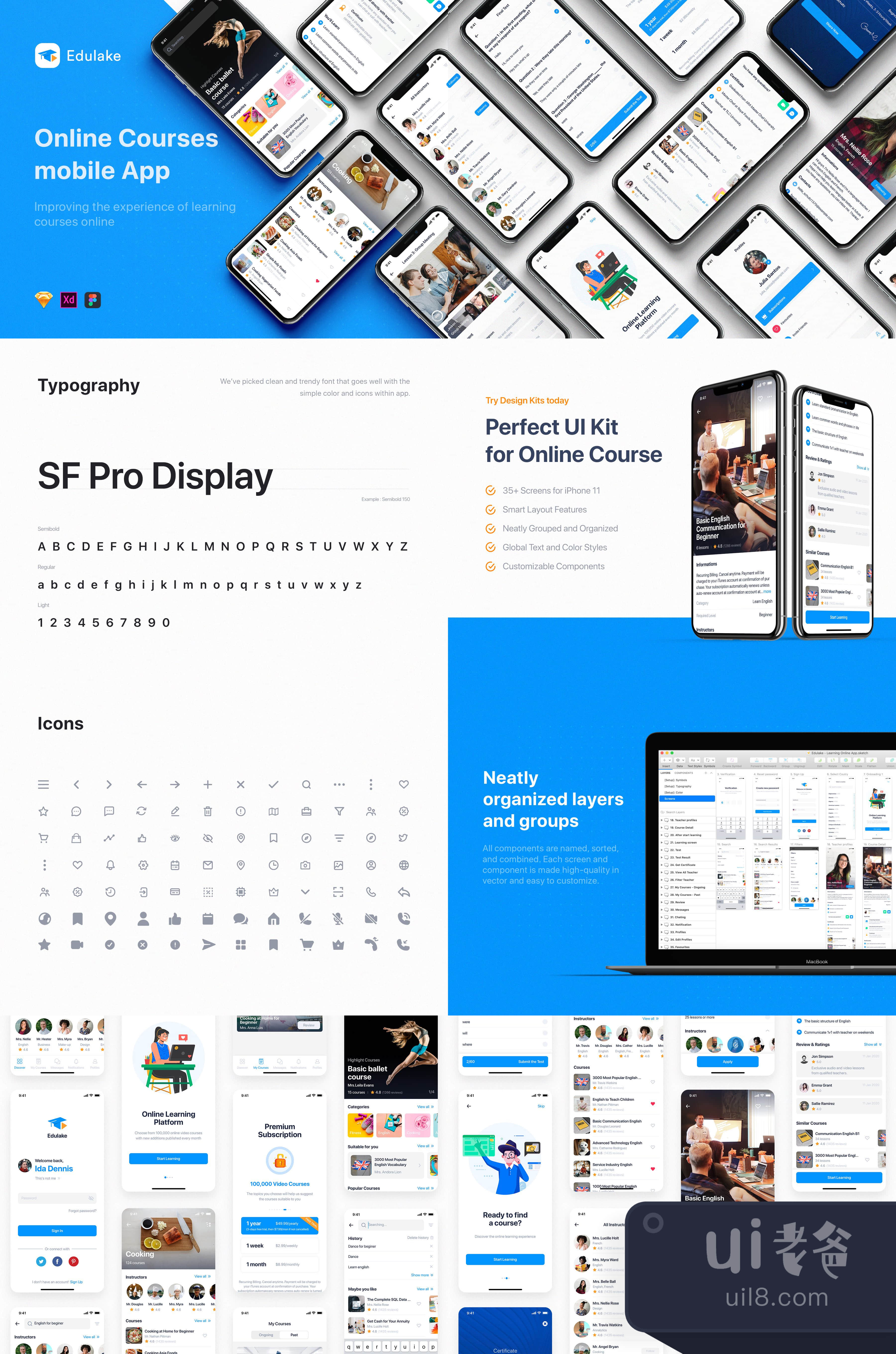 Edulake移动应用UI Kit是一个教育应用,专注于改善在线学习课程的体验。这个UI Kit包括35个移动屏幕,可以随时使用,帮助你加快设计过程。