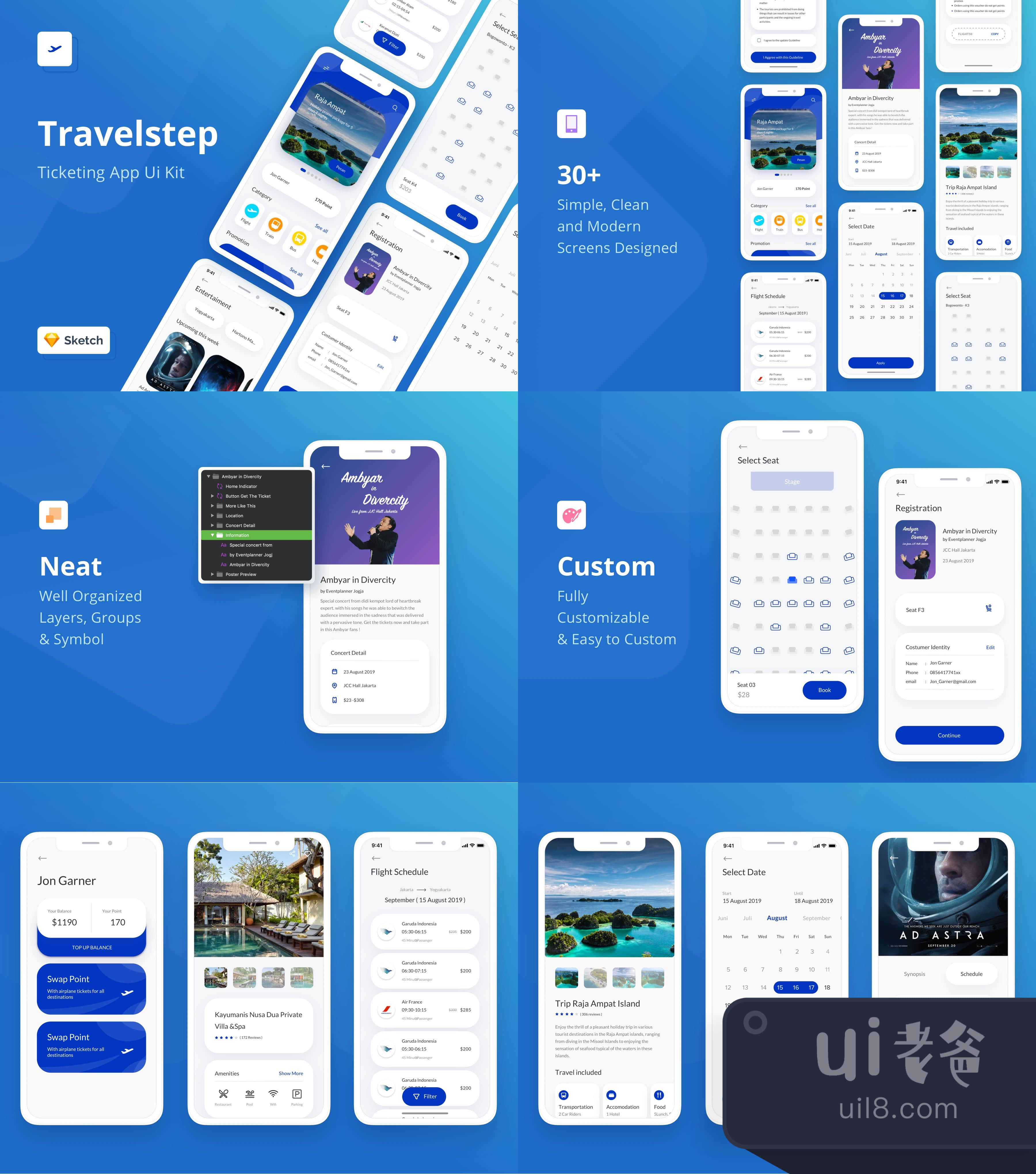 Travelstep是一个简洁的UI工具包,适合你的移动应用程序。配有200多个注重细节的屏幕。所有的符号和对象都是基于矢量的,可以编辑。