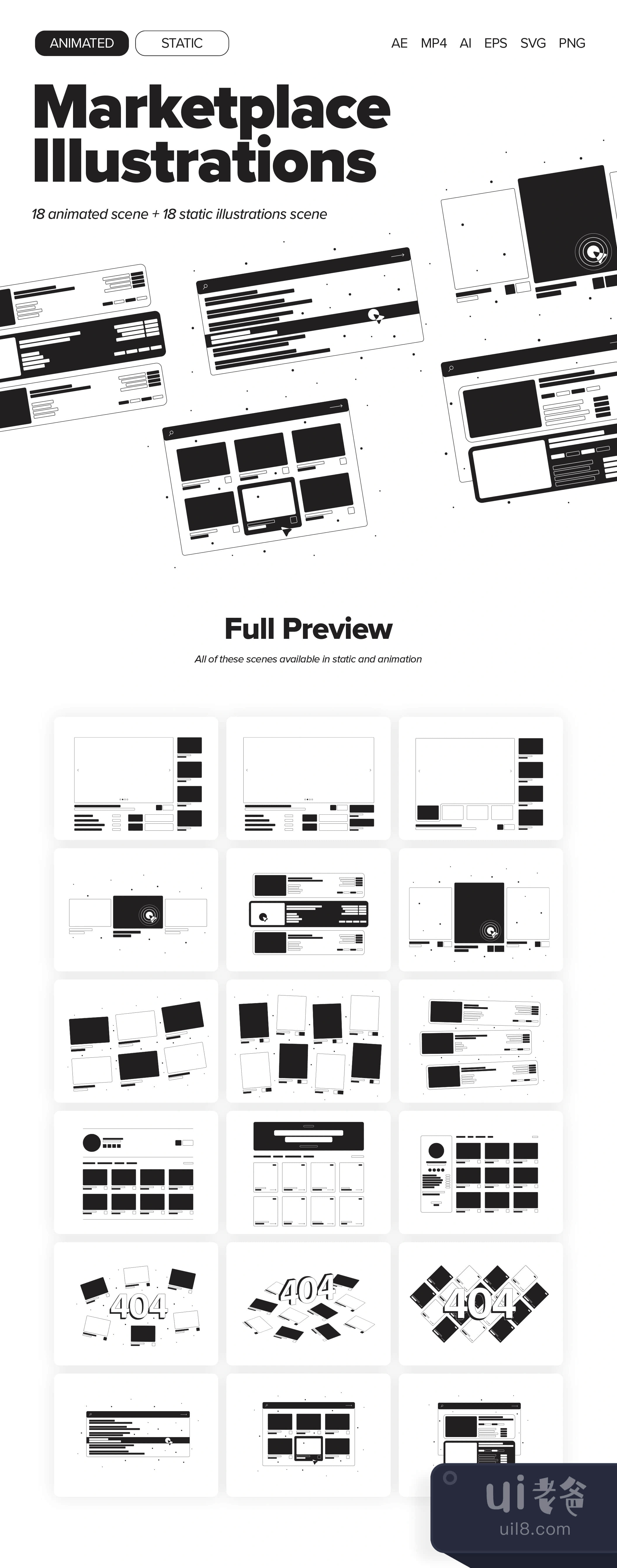 Marketplace Illustrations 这是一个软件包,包含18个循环动画场景和18个关于市场界面的静态矢量场景。非常适用于您的应用程序、网站和商业项目。