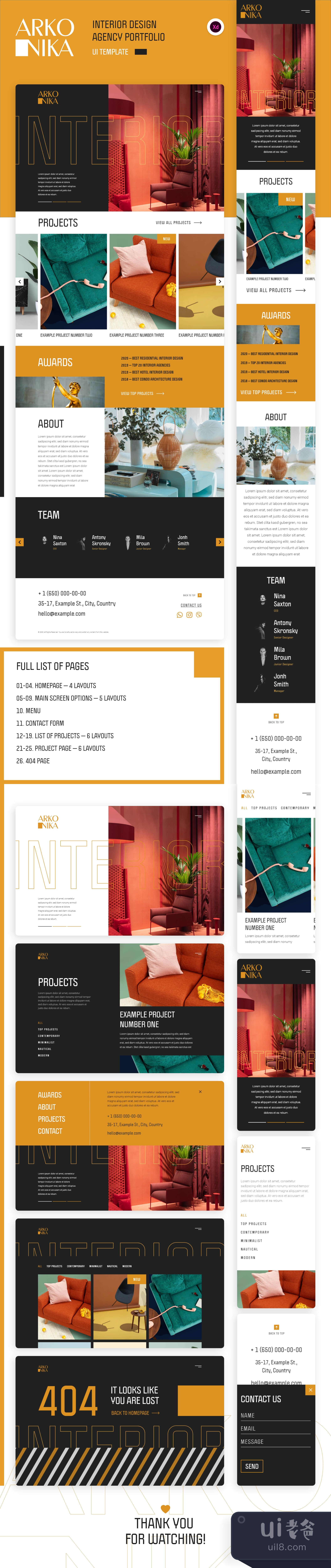 Arkonika - 为室内设计机构制作的UI模板。它包括几种布局,如深色和浅色模式,主页、主屏幕、项目列表和项目展示的几个选项,当然还有桌面和移动版本。当你需要随时可用的漂亮设计模板来展示你的作品集时,这个模板是一个很好的解决方案。Arkonika是简洁、时尚、现代和优雅的UI模板⚡️。