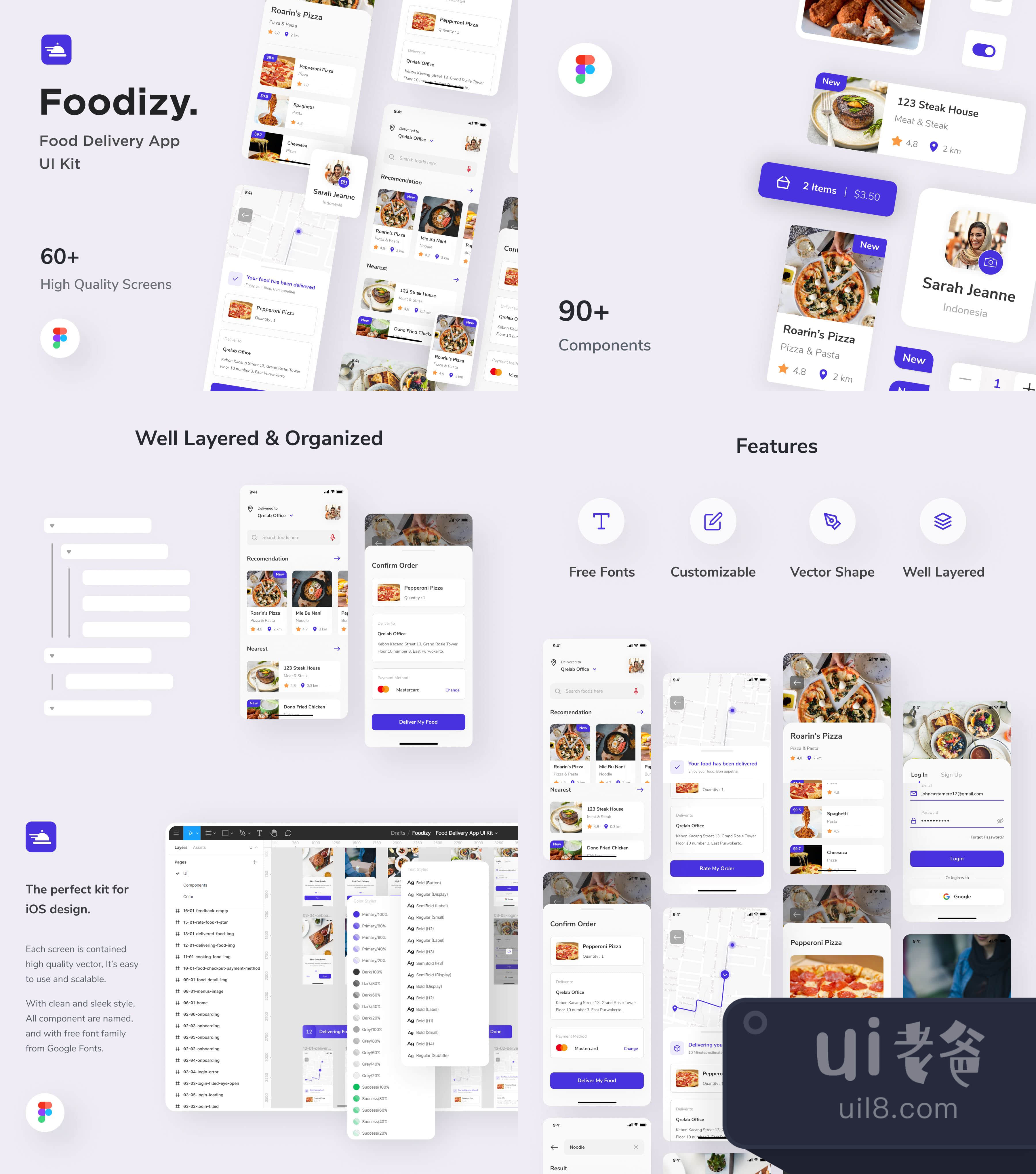 Foodizy UI工具包只与Figma兼容,具有良好的分层和组织,并配有来自谷歌字体的免费字体系列。