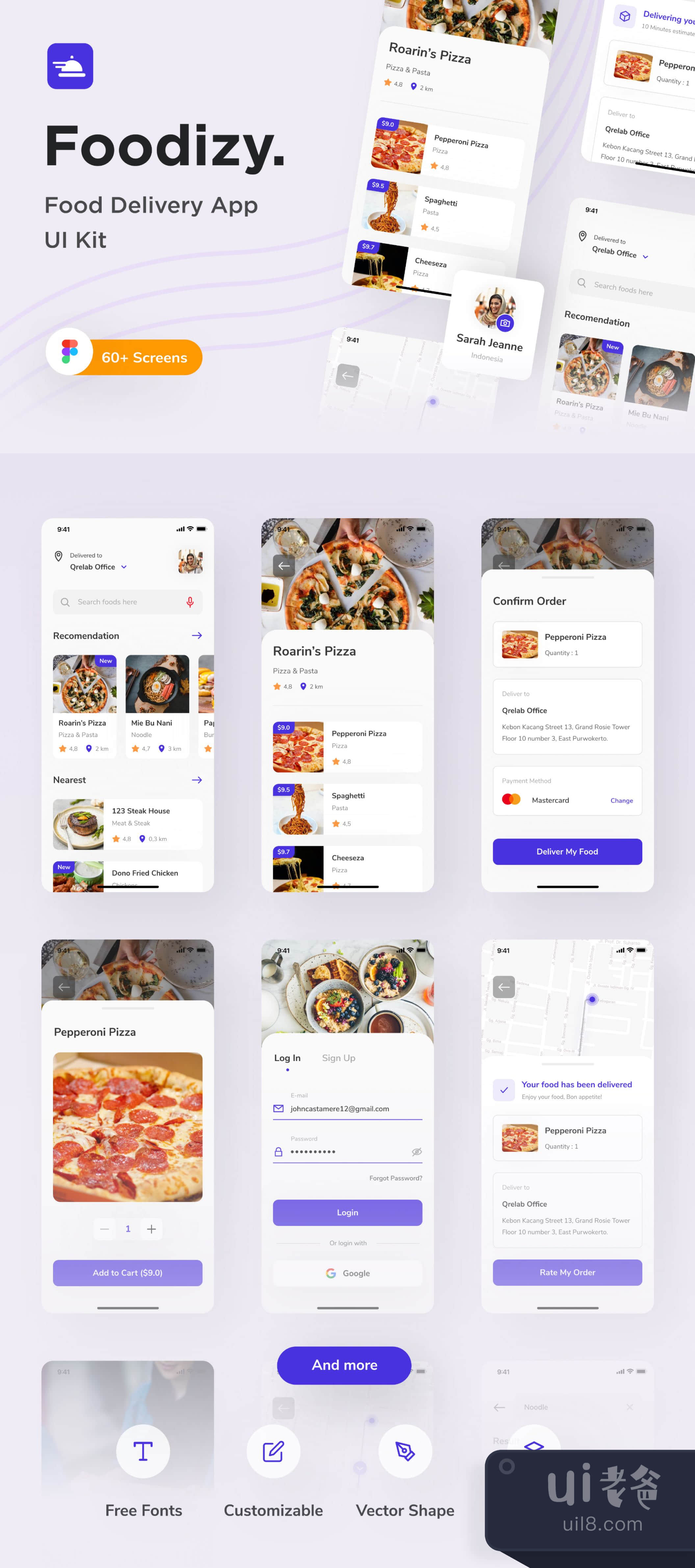 Foodizy是一个具有简洁和时尚风格的食品配送应用程序UI套件,包含60多个高质量的屏幕和90多个组件,适用于iPhone X屏幕尺寸(375px X 812px)的iOS,随时可以使用并准备启动您的设计过程。